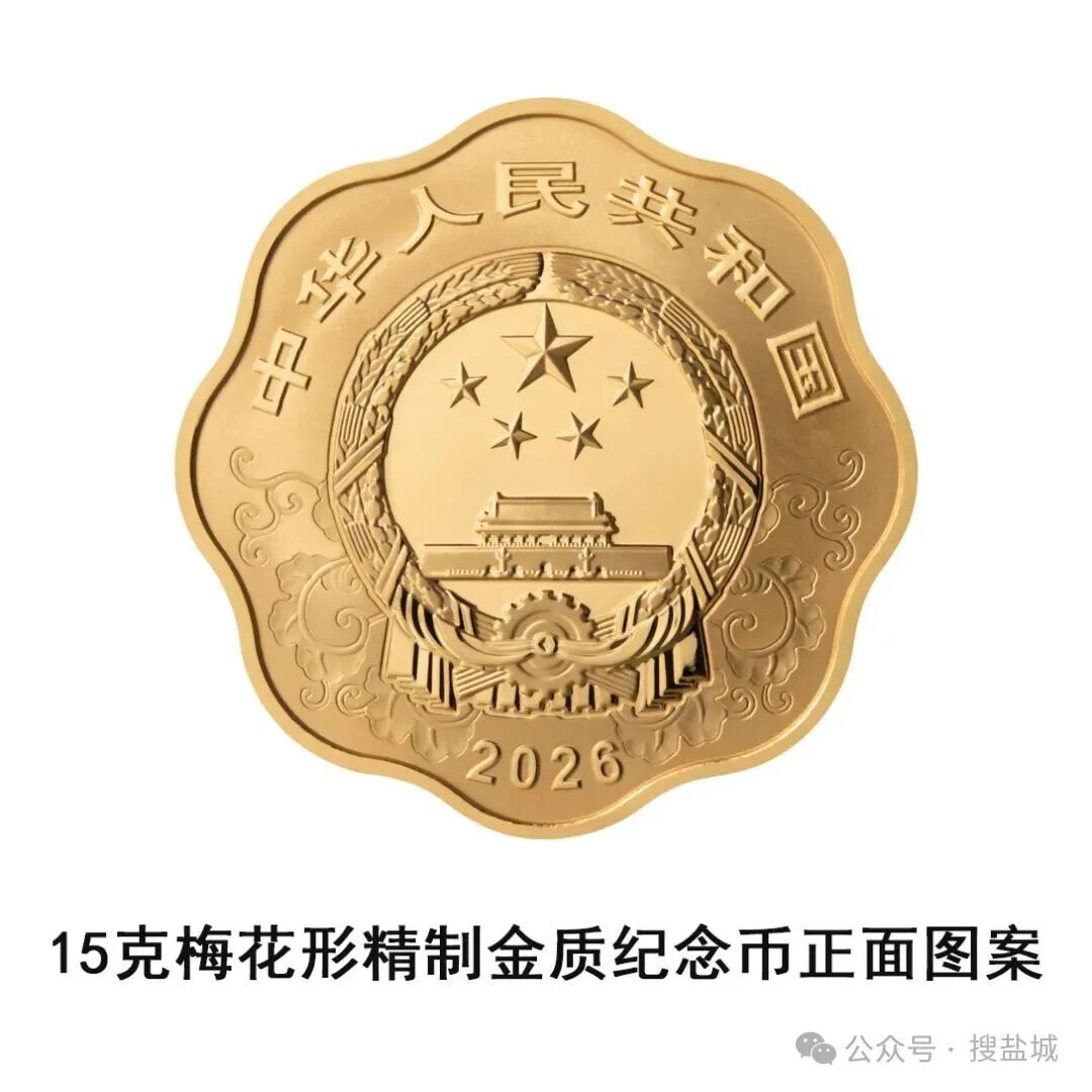 15克梅花形金质纪念币背面图案为奔马剪影造型,并刊“丙午”字样及面额。