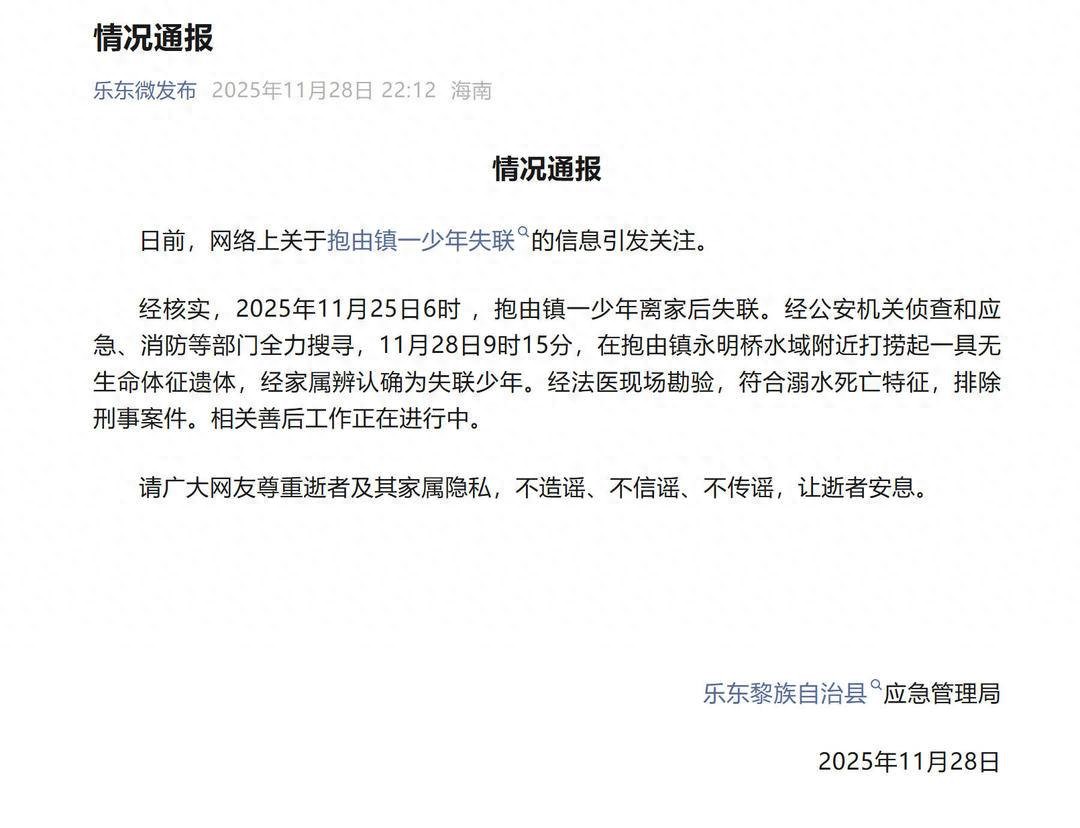 11月28日,海南乐东黎族自治县应急管理局发布情况通报:日前,网络上关于抱由镇一少年失联的信息引发关注。经核实,2025年11月25日6时,抱由镇一少年离家后失联。经公安机关侦查和应急、消防等部门全力搜寻,11月28日9时15分,在抱由镇永明桥水域附近打捞起一具无生命体征遗体,经家属辨认确为失联少年。经法医现场勘验,符合溺水死亡特征,排除刑事案件。相关善后工作正在进行中。请广大网友尊重逝者及其家属隐私,不造谣、不信谣、不传谣,让逝者安息。