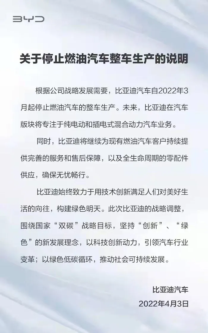 2022年4月,比亚迪发布公告,宣布公司自2022年3月开始,停止燃油汽车的整车生产,转而专注于纯电动车和插电式混合动力汽车的研发与销售。