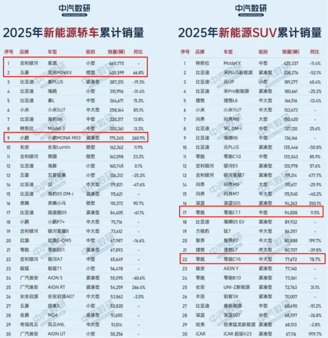 具体来看,在10万元以下入门市场,比亚迪海鸥曾经长期稳居榜首。但随着吉利星愿的“杀出”,其凭借更高的性价比和颜值,抢占了海鸥“销冠”的头衔。数据显示,2025年,星愿卖了46万多辆,平均下来每分钟就卖出一辆。而这一价格区间还有另一“强敌”——上汽通用五菱MINIEV家族,其在2025年共销售了43.56万辆新车。
