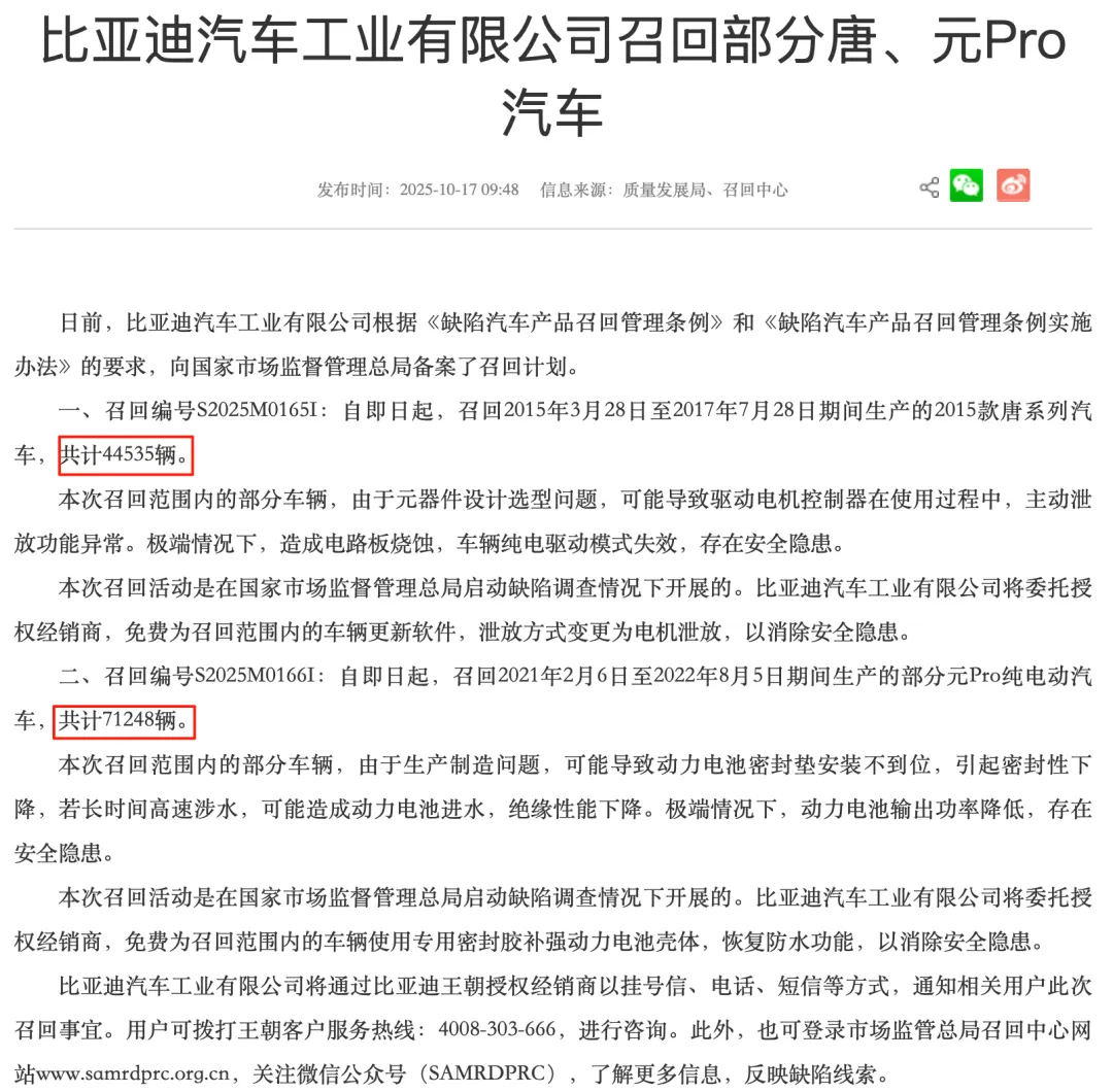 2025年10月17日,比亚迪就已因两类不同质量问题,先后被动召回两款车型:其中44535辆2015款唐系列车型,因驱动电机控制器设计存在缺陷,可能导致电路板烧蚀进而引发车辆动力失效;另有71248辆元Pro纯电动汽车,因动力电池密封垫安装不规范,存在涉水后进水的安全隐患。