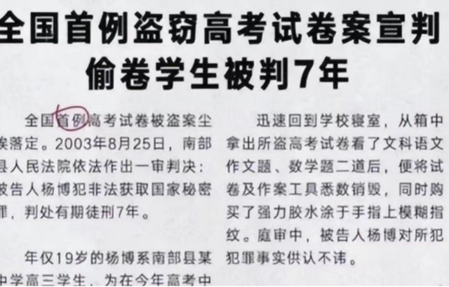 2003年8月25日,南部县人民法院以非法获取国家秘密罪,判处杨博有期徒刑7年,如果他没有偷窃高考试卷,或许彼时他即将走入心仪的大学校园了,造化弄人,让人唏嘘。