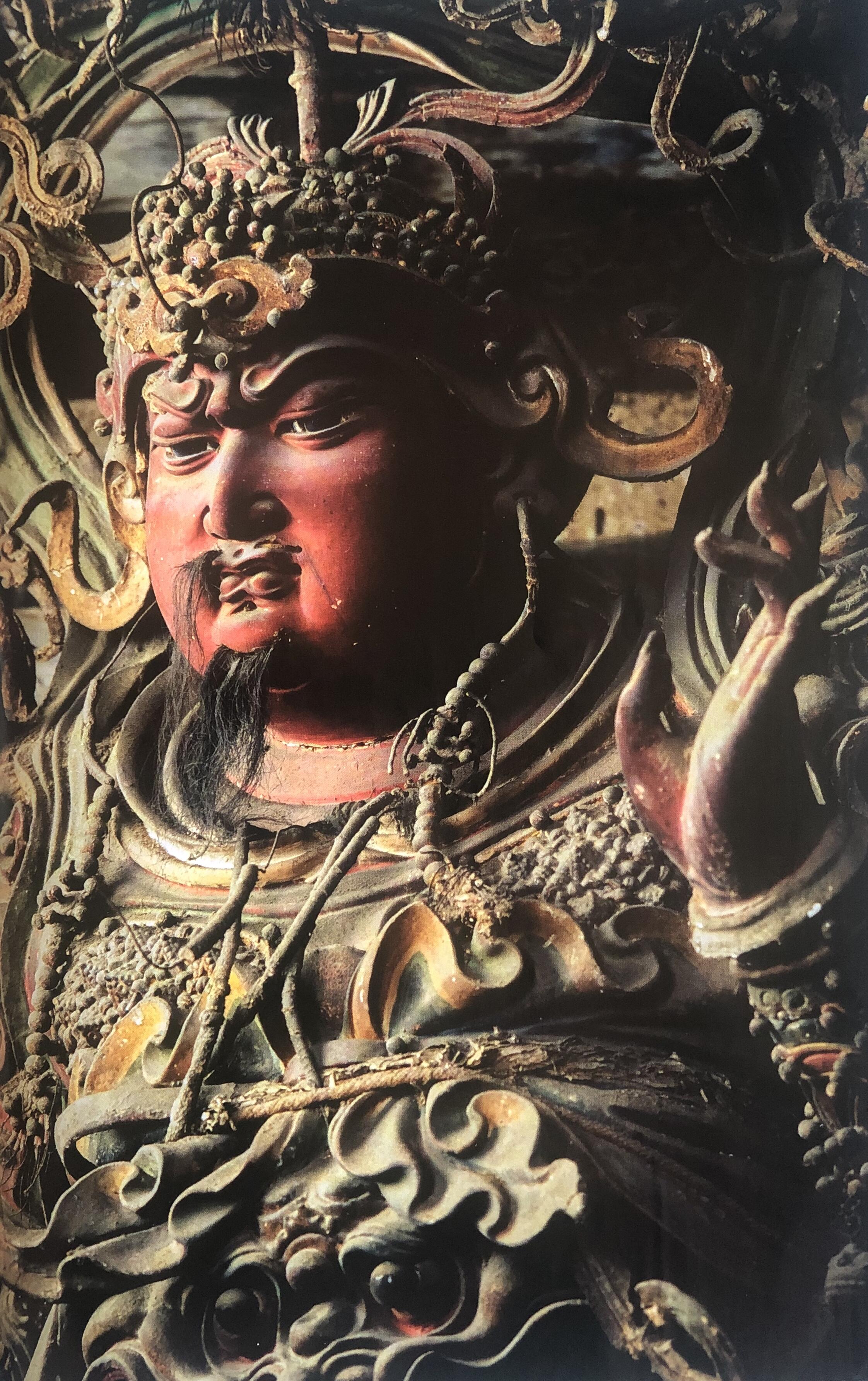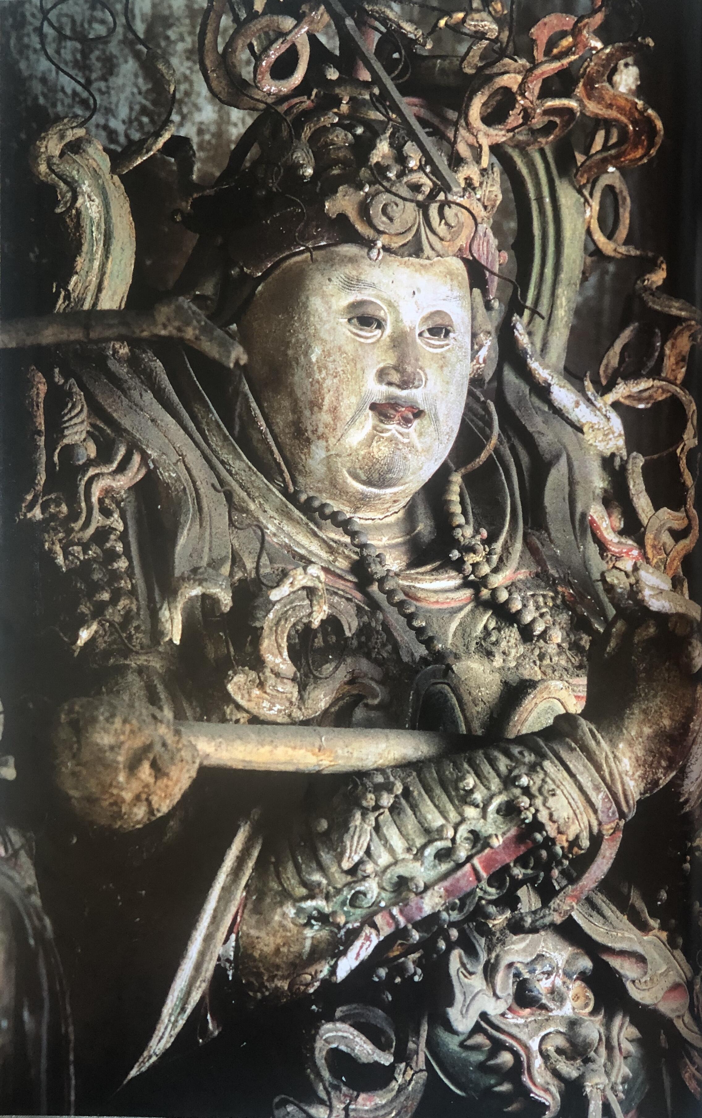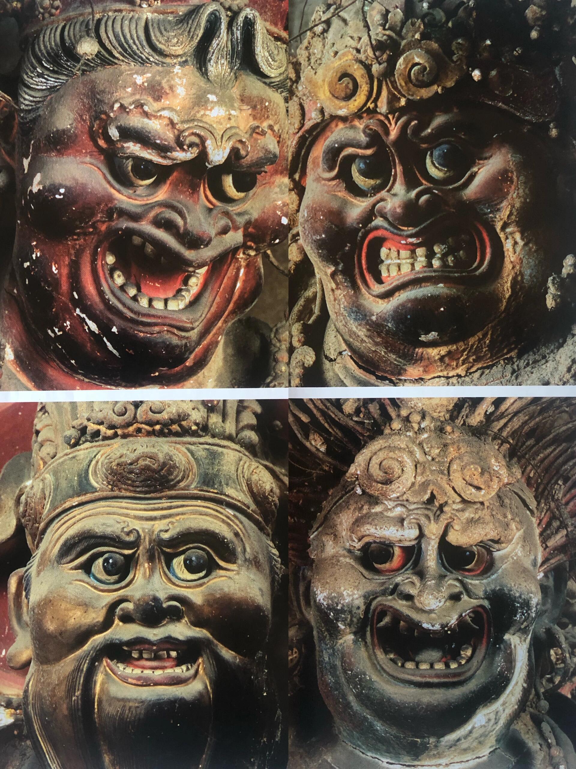 更令人称奇的是铁佛寺独特的造像布局。四大天王分立殿堂四角,南侧进门处杨戬与关羽的塑像颇具晋东南地域特色。这种打破常规的排列方式,在全国寺观中独树一帜,也让铁佛寺的彩塑群更具辨识度。在这里,佛、圣、神、人、鬼、妖、魔共聚一堂,庄严与荒诞并存,肃穆与诙谐交织,构建出一个奇幻的宗教艺术世界。