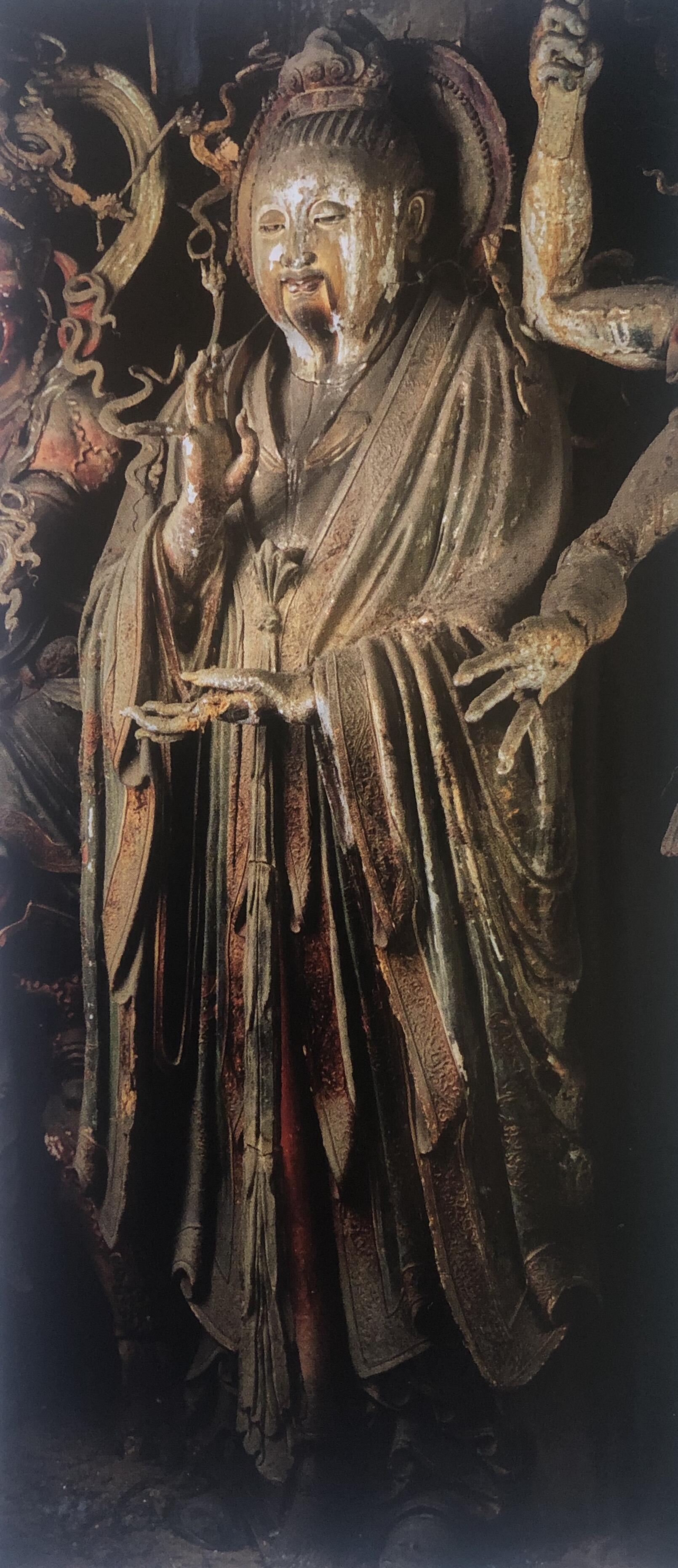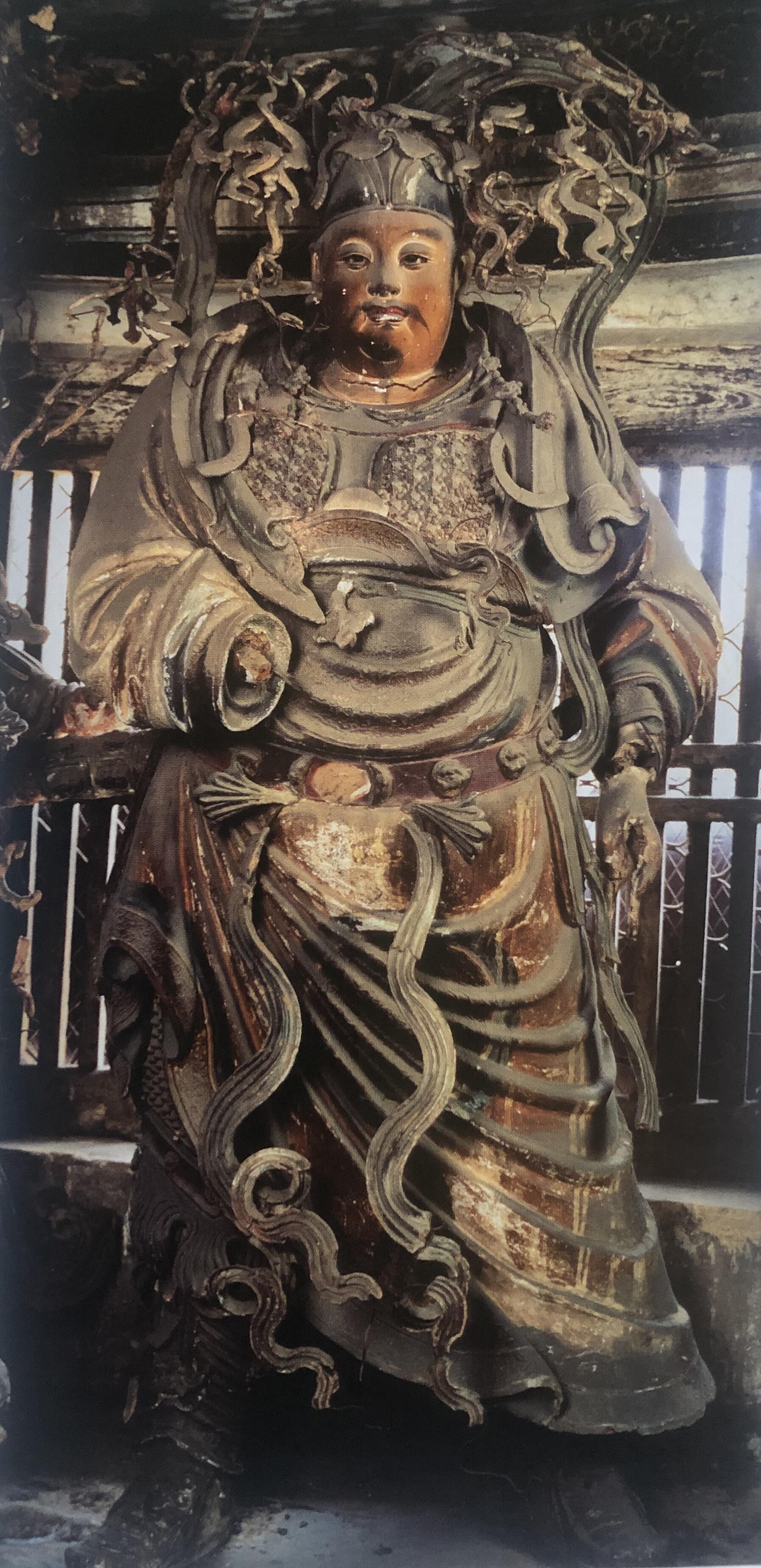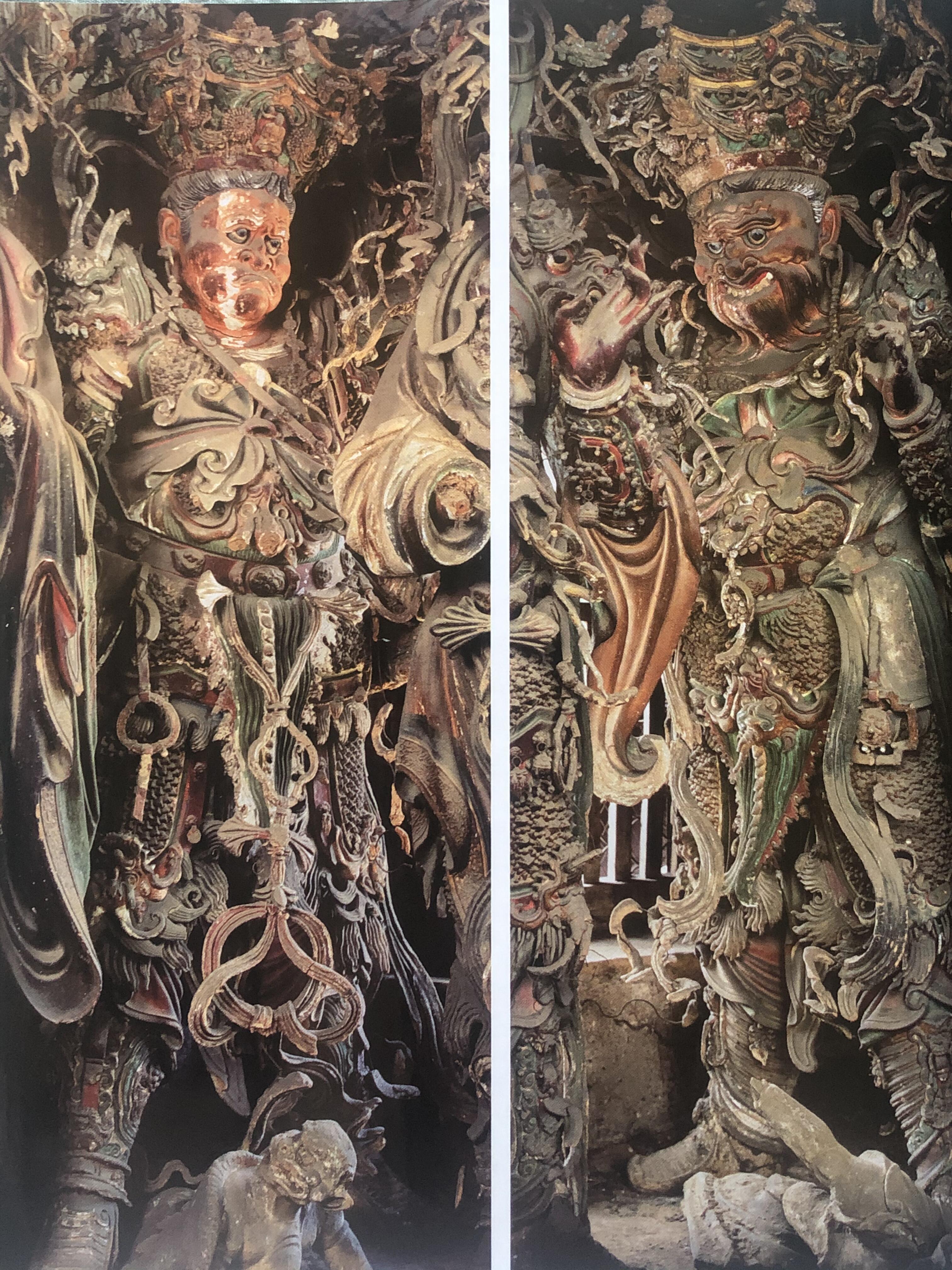 更令人称奇的是铁佛寺独特的造像布局。四大天王分立殿堂四角,南侧进门处杨戬与关羽的塑像颇具晋东南地域特色。这种打破常规的排列方式,在全国寺观中独树一帜,也让铁佛寺的彩塑群更具辨识度。在这里,佛、圣、神、人、鬼、妖、魔共聚一堂,庄严与荒诞并存,肃穆与诙谐交织,构建出一个奇幻的宗教艺术世界。