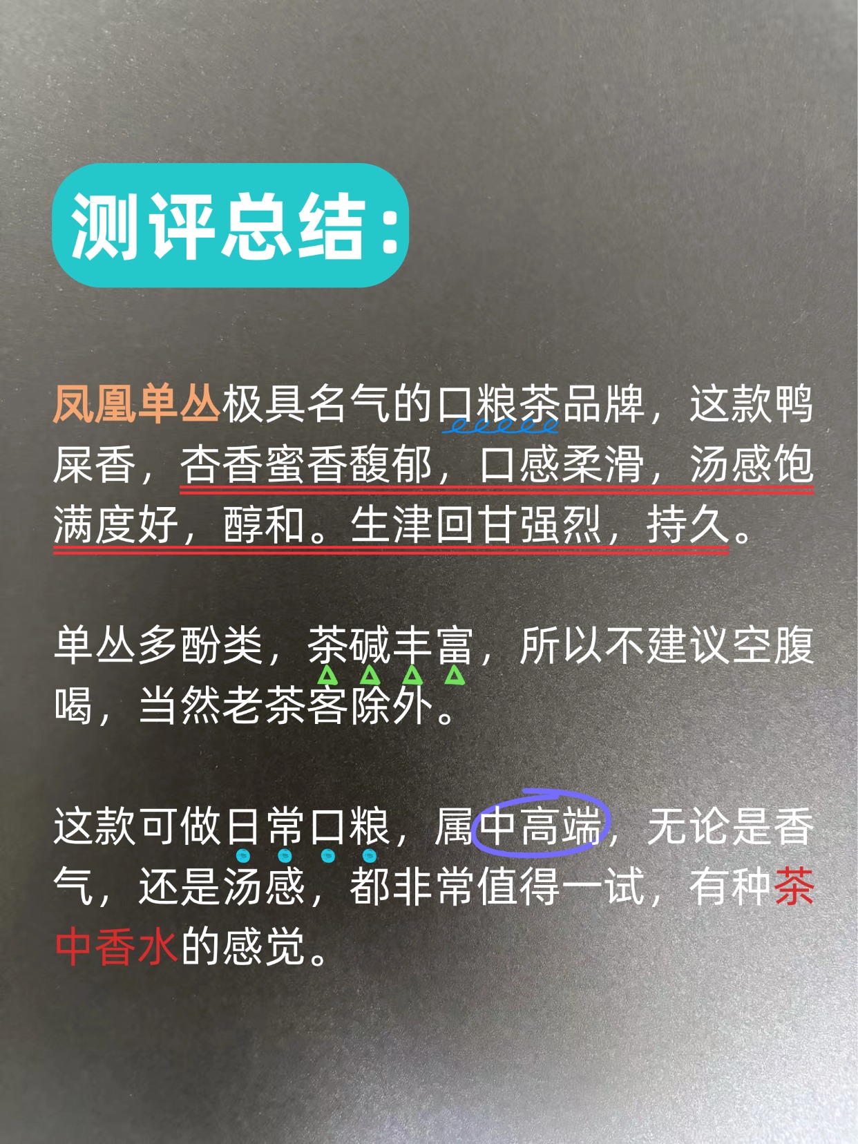 总评,凤凰单丛极具名气的口粮茶品牌,这款鸭屎香,杏香蜜香馥郁,口感柔滑,汤感饱满度好,醇和。生津回甘强烈,持久。单丛多酚类,茶碱丰富,所以不建议空腹喝,当然老茶客除外。