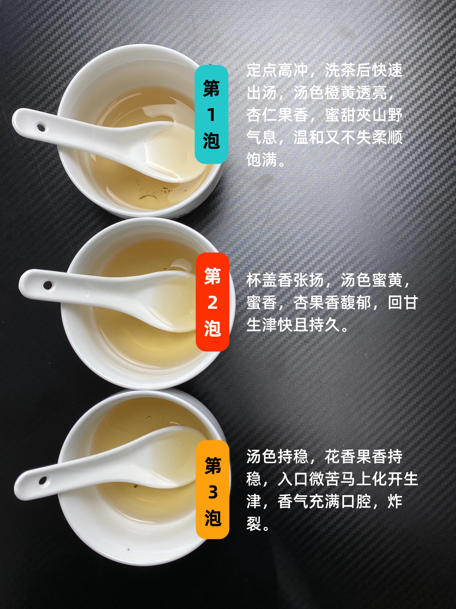 第二泡,杯盖香张扬,汤色蜜黄,蜜香,杏果香馥郁,回甘生津快且持久。