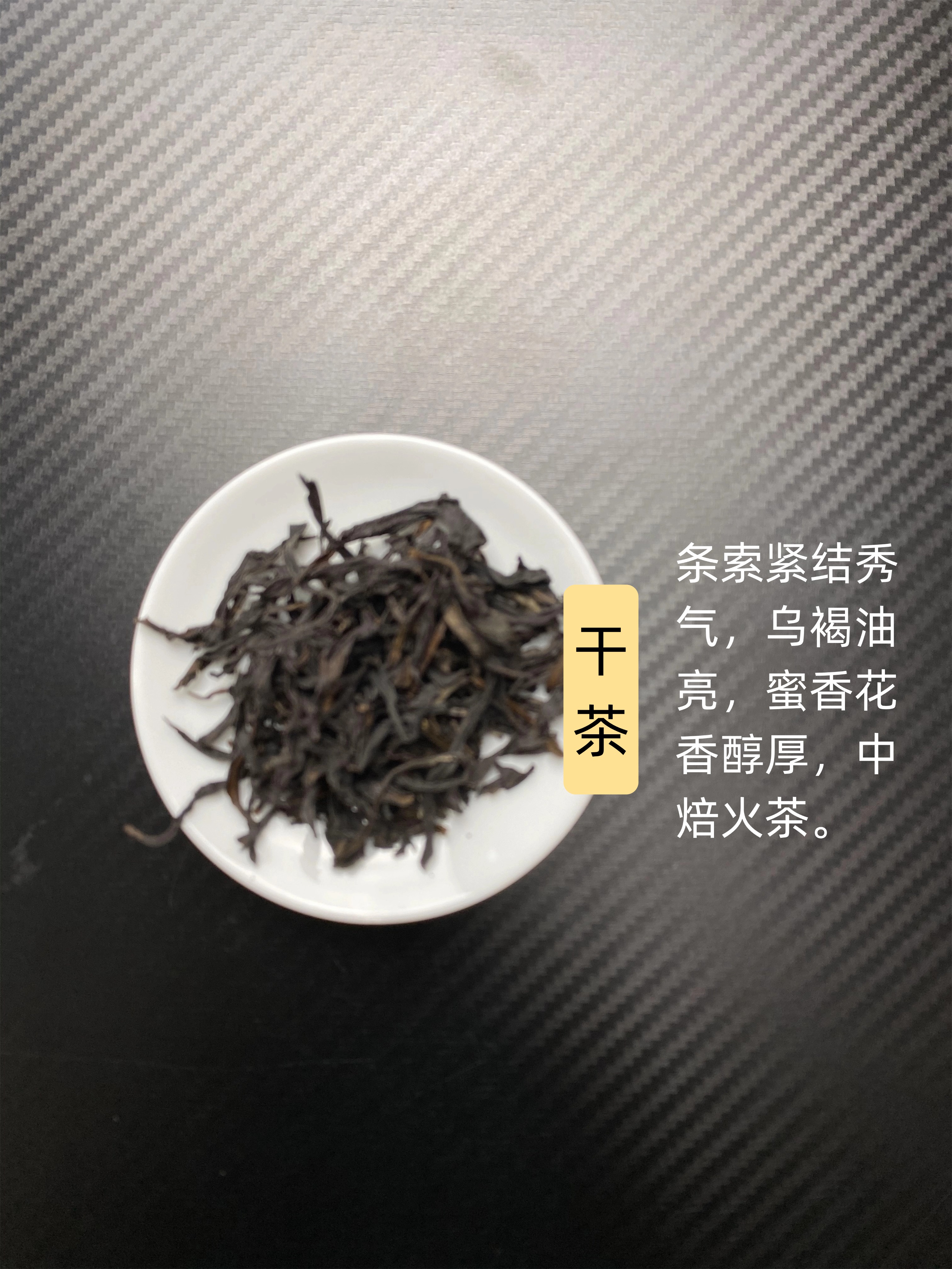 干茶,条索紧结秀气,乌褐油亮,蜜香花香醇厚,中焙火茶。