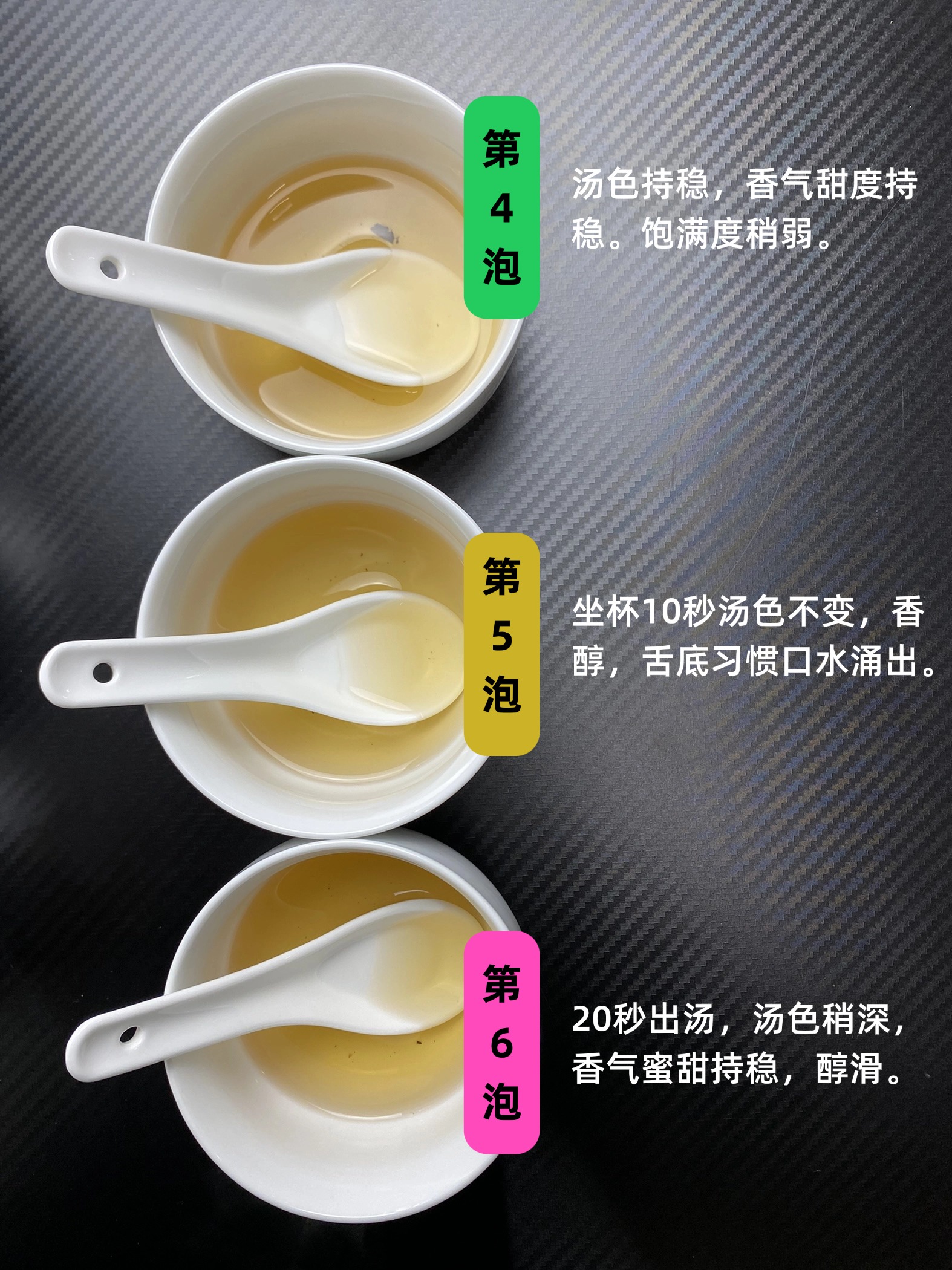 第三泡,汤色持稳,花香果香持稳,入口微苦马上化开生津,香气充满口腔,炸裂。