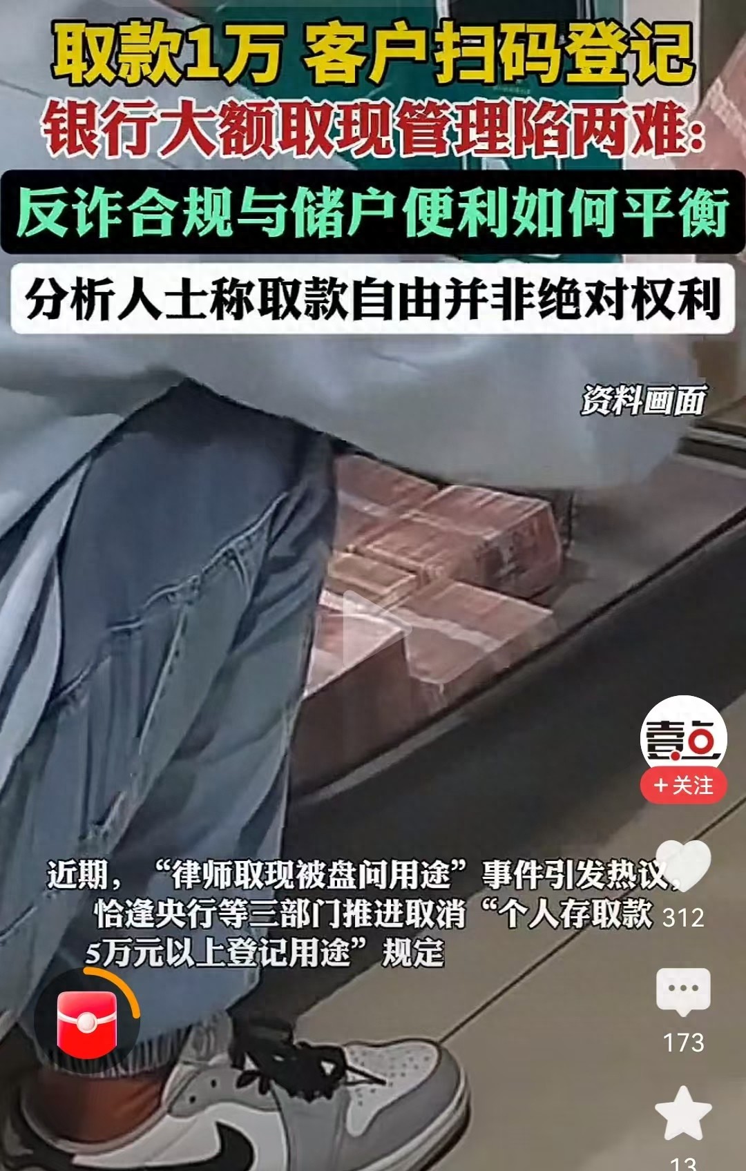 其实,我们真的应该要强力捍卫储户的取款自由!反诈和反洗钱的犯罪活动,银行完全可以利用合规的处理流程、央行的管理规定,最终给自己免责,所以就是要保证“储户取款自由”的基本权利!银行也可以用大数据以及目前的AI技术,实现事后的追查和责任分析,而不能使用霸道的当面柜面要求,涉嫌侵犯储户的个人信息权利。