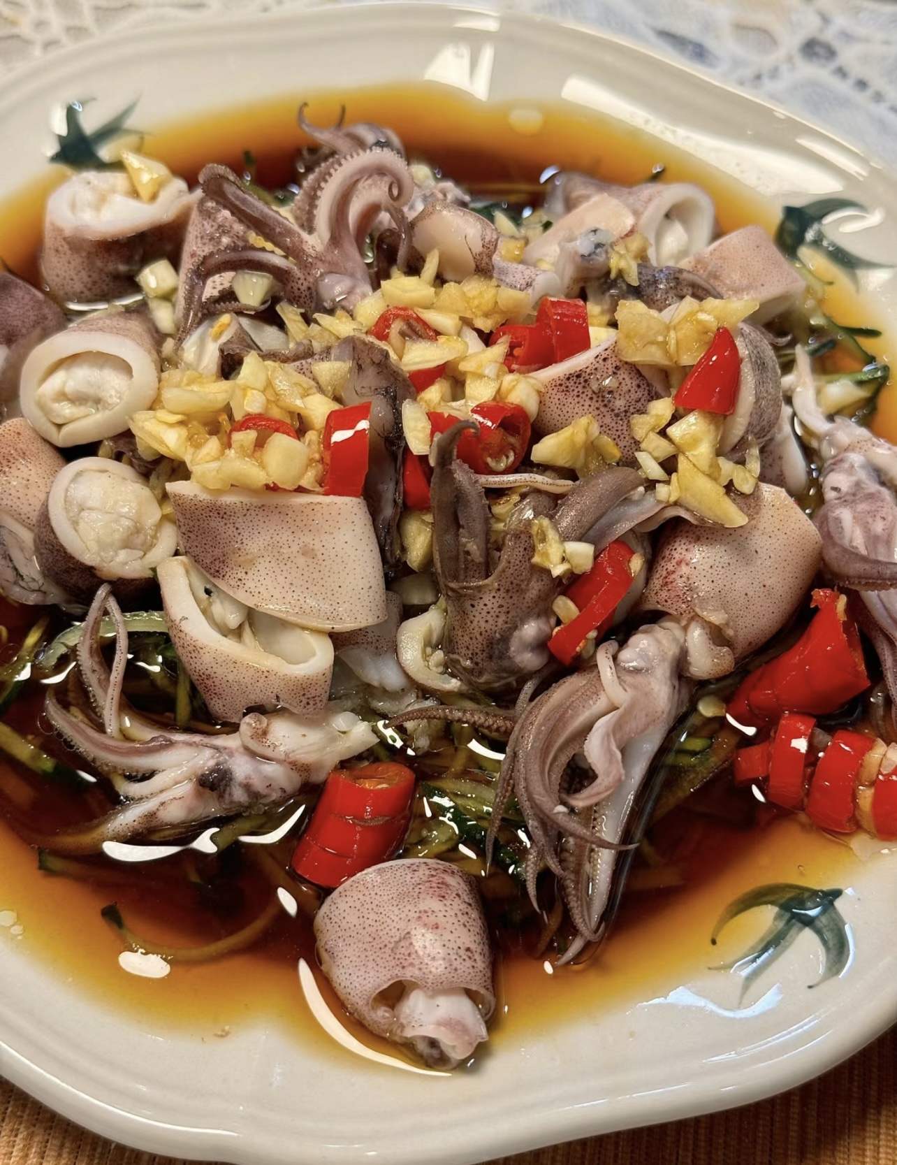 在这食欲萎靡的时刻,我那刁钻的味蕾开始渴望一份清淡而又能唤醒活力的美食。于是,芥末捞汁鱿鱼便在我的脑海中闪现,仿佛是一位拯救味蕾的使者。