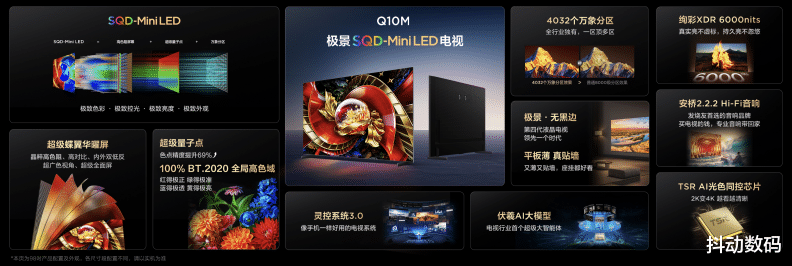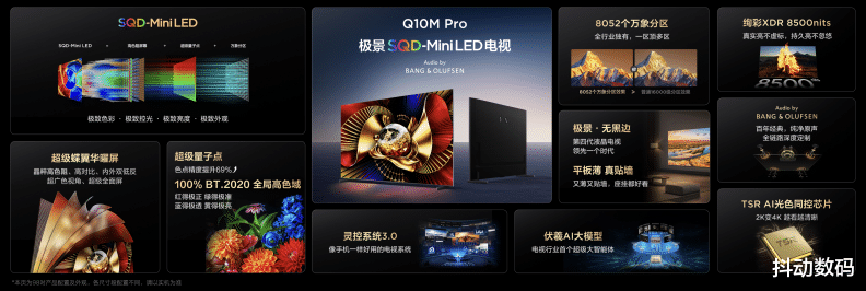 Q10M则代表着TCL技术普惠的坚定决心。其在核心显示技术上与Pro版看齐,同样实现了SQD技术的100% BT.2020全局高色域、超级量子点与超级蝶翼华曜屏的越级搭载。在万象分区数量、峰值亮度及芯片算力等方面亦实现大幅升级,确保在主流价位提供超越期待的旗舰画质体验。TCL Q10M的出现,将SQD-Mini LED的体验门槛大幅降低。
