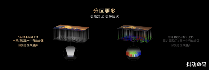 控光分区是Mini LED技术的灵魂,直接决定对比度与画面纯净度。SQD-Mini LED进一步将Mini LED“一灯一分区”的优势发挥到极致。而RGB-Mini LED至少需红、绿、蓝三颗灯珠组成一个基础发光单元,才能形成一个有效控光分区。