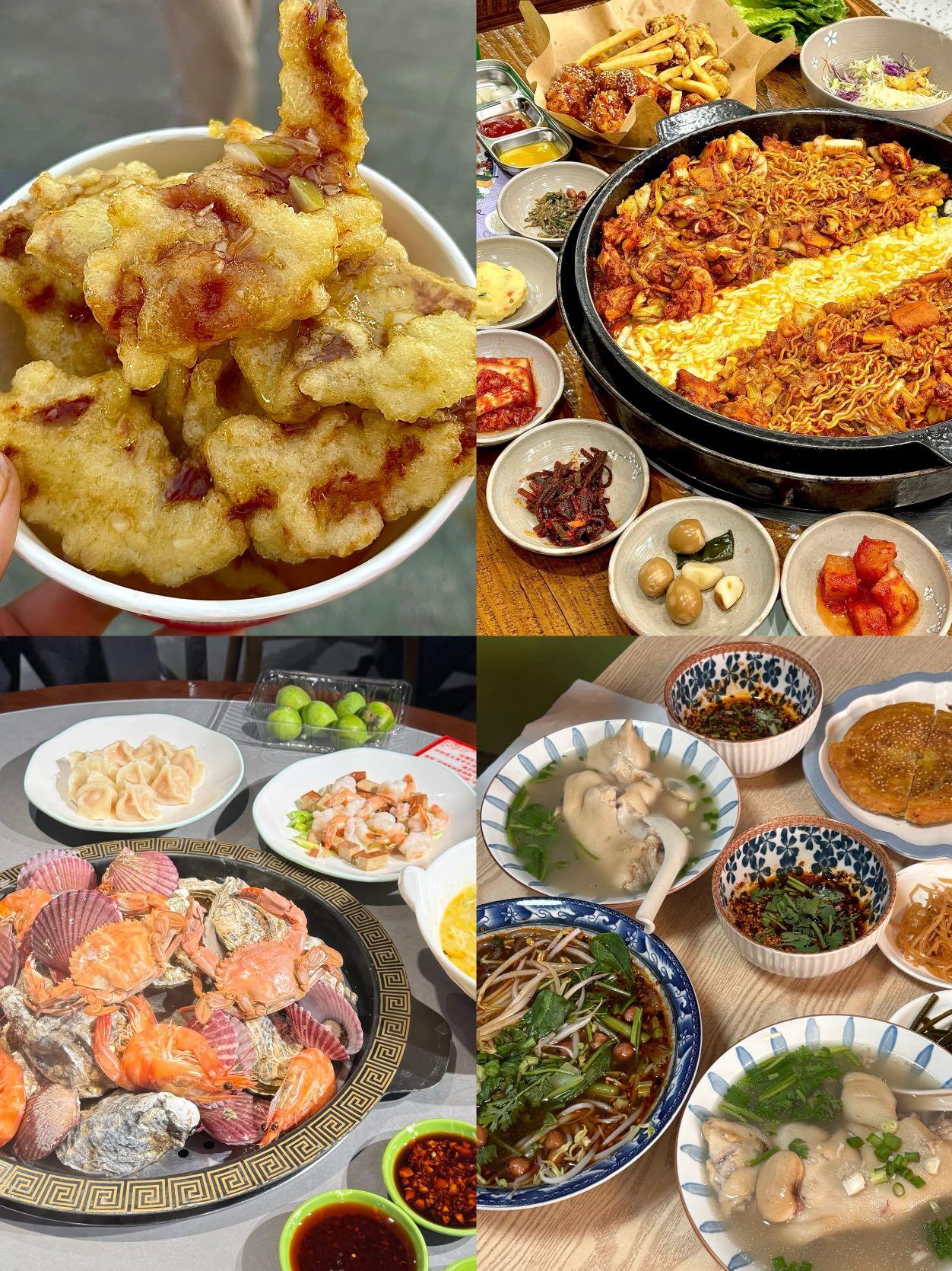 下午五点才开市,别去早了!冬天逛小吃街太幸福了,钻进一家韩式料理店,暖乎乎的氛围瞬间驱散寒意。有韩国超市可以买些零食,路边的炒年糕、鱼饼串冒着热气,捧着吃超满足。