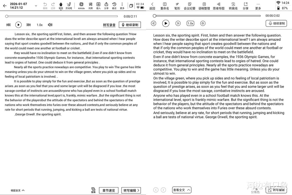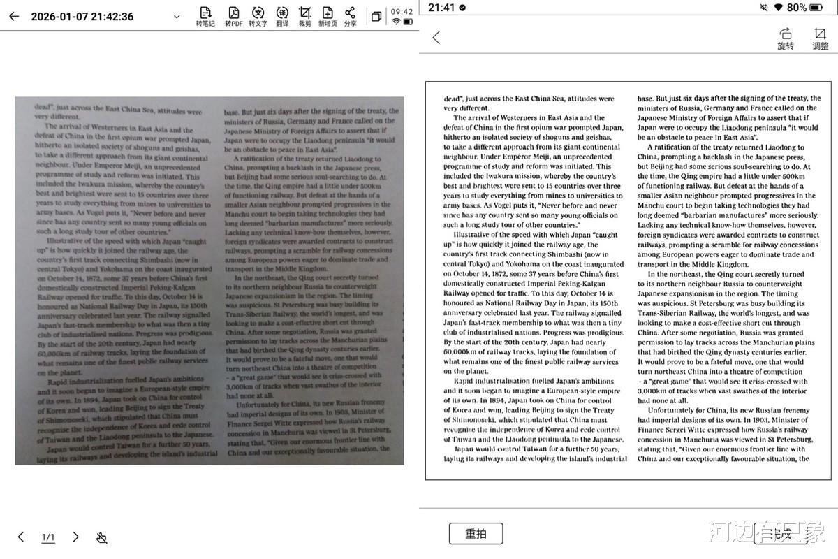 两个设备都提供转文字功能,不过讯飞X5Pro无法识别分栏内容,直接当作一行识别,没有汉王M10自动分栏那么智能。