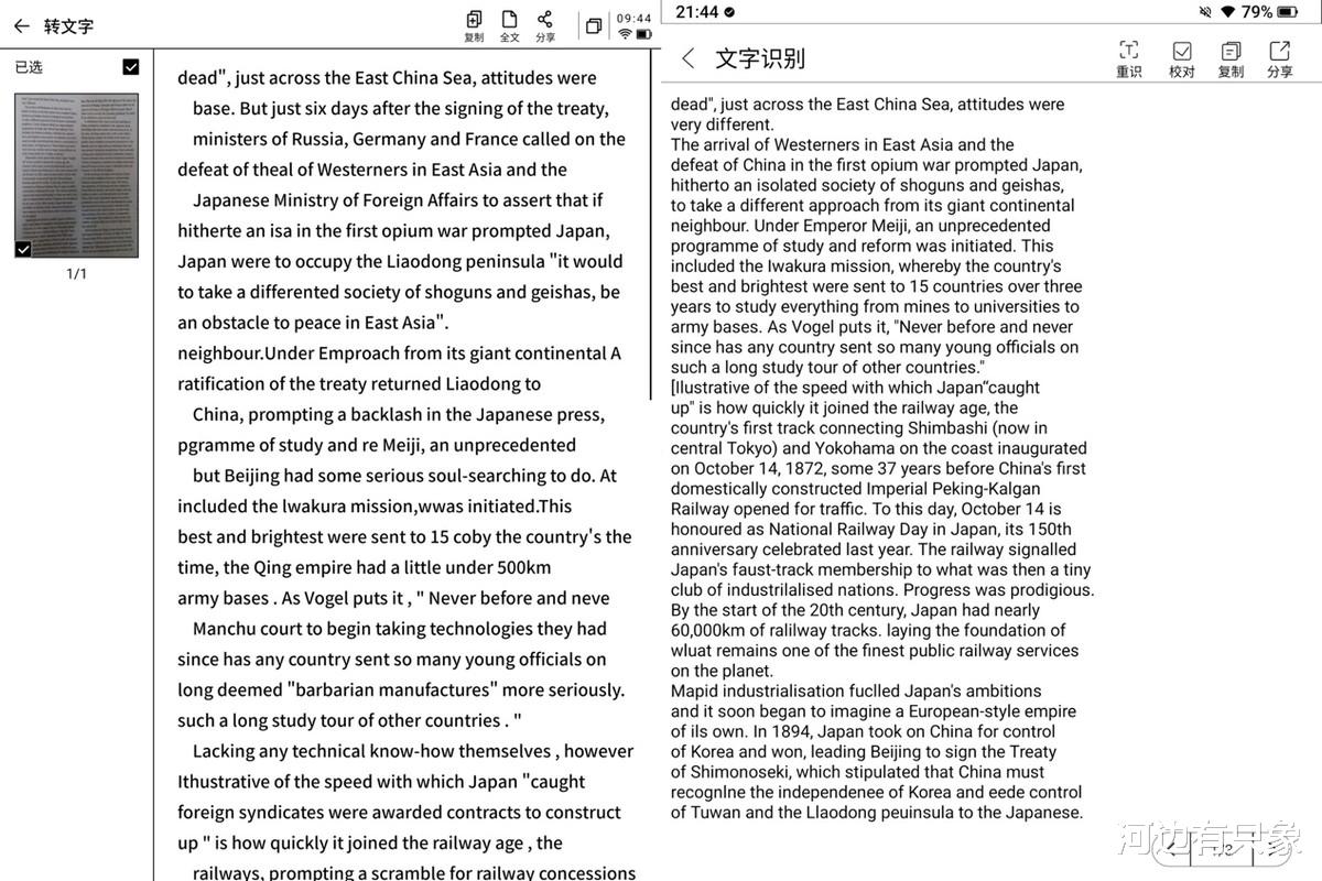 汉王M10还有一个贴心的功能,那就是“校对”,我们可以上下对照原版和识别后的内容,方便校正文字,让内容更准确。这个功能上,汉王完胜。