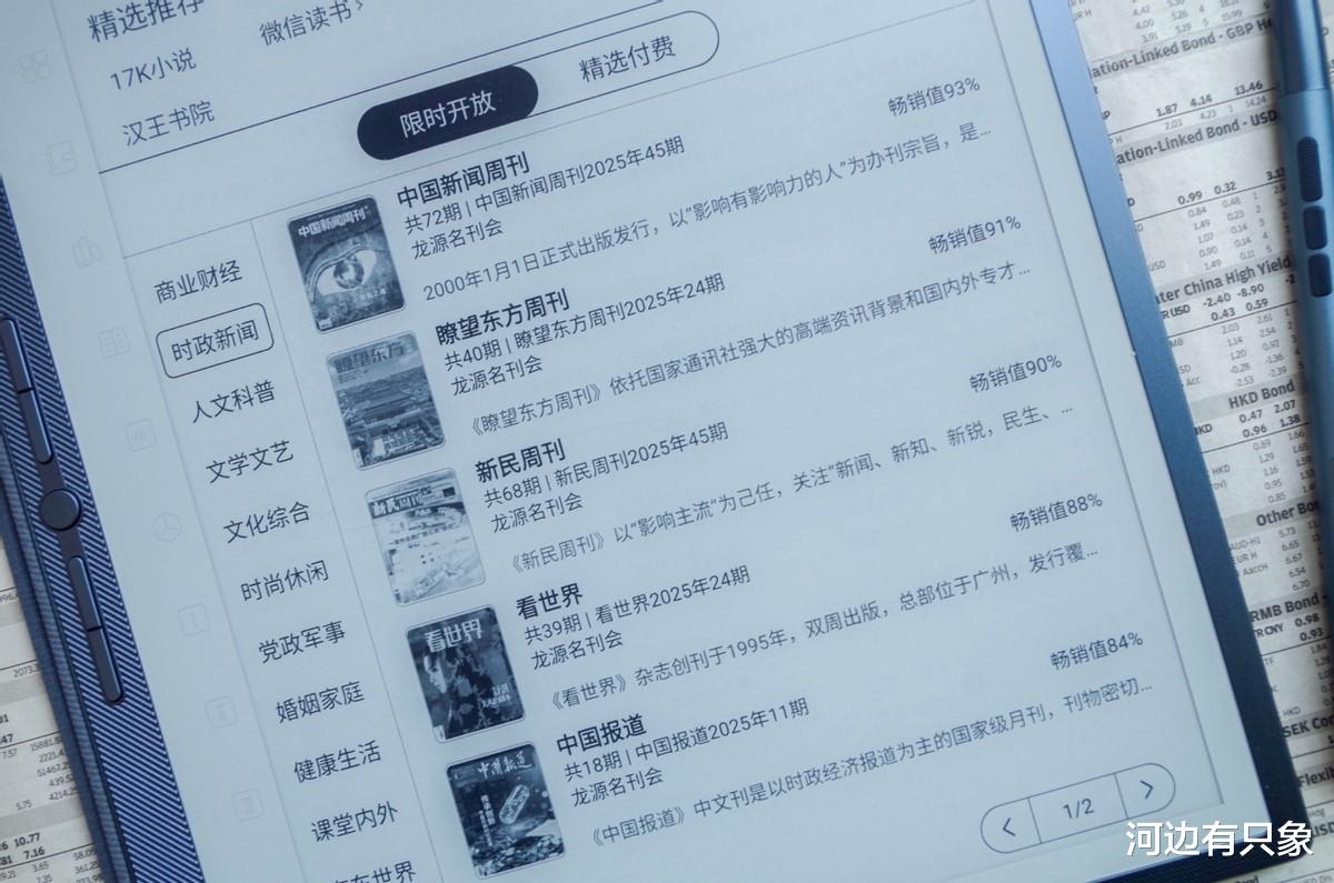 从去年开始,汉王跟龙源网合作,提供四十种免费杂志也是随便看,不少受欢迎的期刊都在限时免费目录里,比如大象很喜欢的《中国新闻周刊》《新民周刊》和《瞭望东方周刊》。