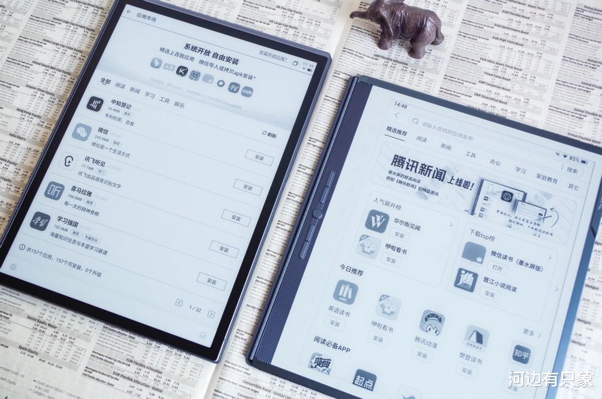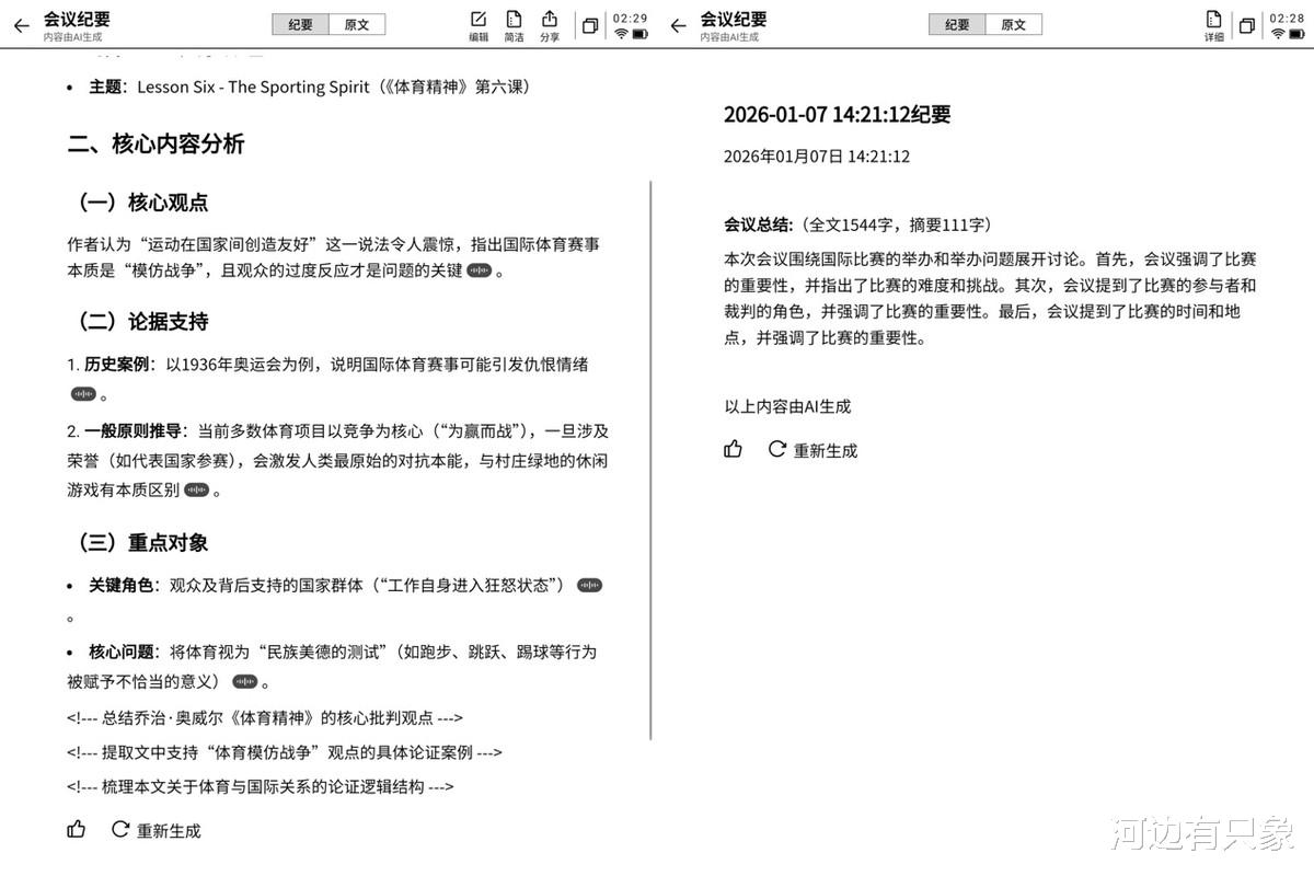 最后说几句作为目前两家头部墨水屏办公厂商,产品都是可圈可点,特别是讯飞X5Pro新品升级之后终于跟上了汉王M10的脚步,可在产品完成度上依然有着一定的距离,特别是在强调的AI属性功能上来说。在讯飞引以为傲的录音转写没有优势下,AI辅助的整理依然停留在能用的基础上,汉王M10就是一个更好用的AI辅助。在阅读功能上,汉王提供大量免费图书和期刊,省钱又省心。虽然X5Pro已经开放了第三方APP安装,但是优化还待提升,不少APP明显卡顿,不如M10这个已经一年的产品;另一方面,汉王M10还提供了很多独家的功能,做到人无我有,人有我优。如果预算足,需要随时的网络通信功能,不妨考虑讯飞X5Pro;如果想要一个全能的墨水屏办公本,那么实惠又实用的汉王M10依然是最优解!