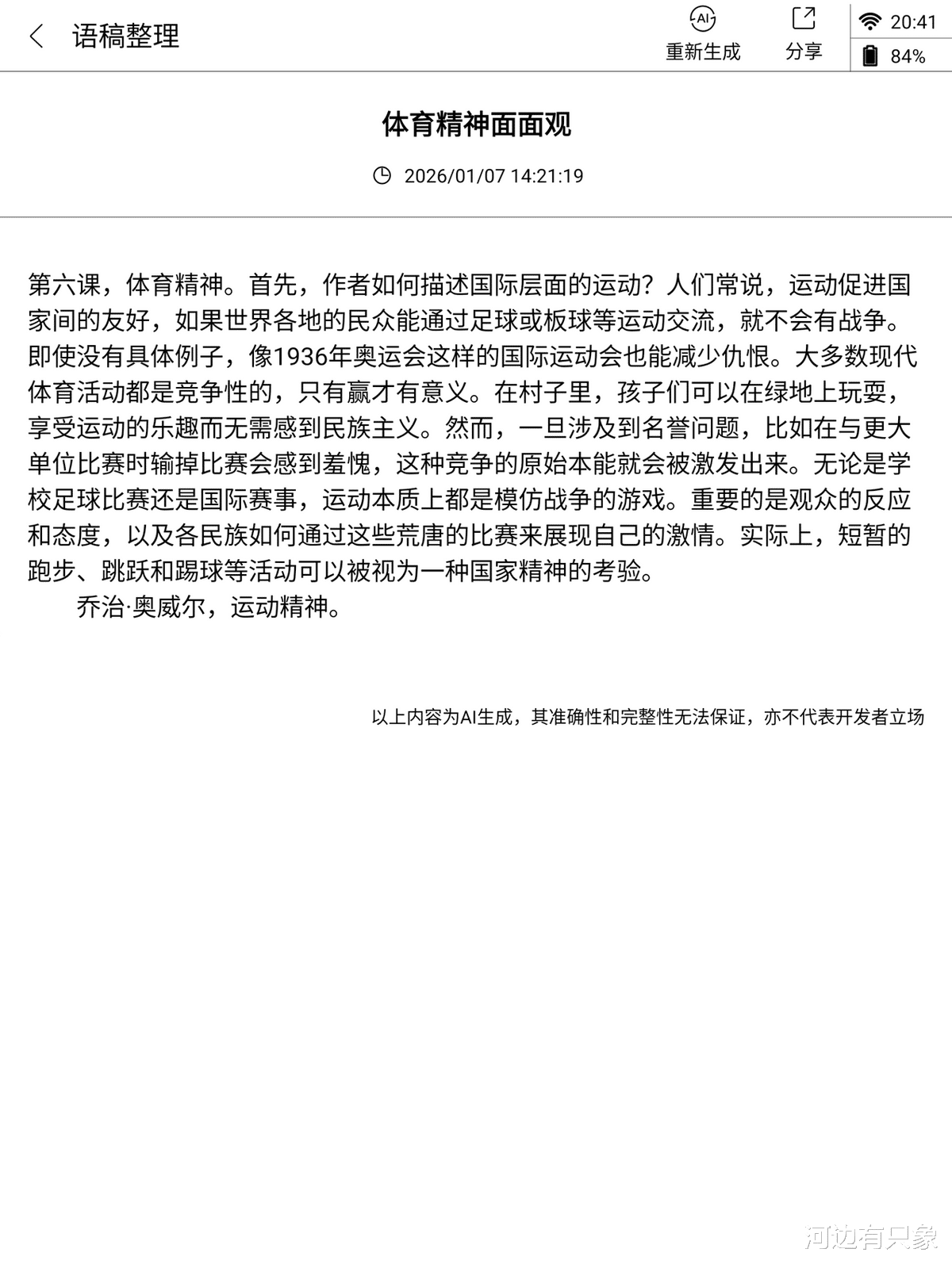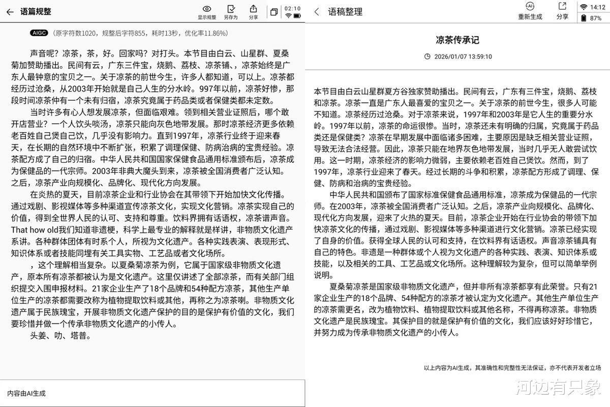 两家的设备都提供AI语稿整理功能,就是根据转写的文字再次智能编辑,获得更准确的文字。在讯飞的这个功能叫“语篇规整”,而汉王叫“语稿整理”。这里可以看到讯飞只是整理了一下文字,依然保留口语和错别字,但是汉王则可以真正对文本进行整理,提供一个标准书面语文本,明显更加实用。