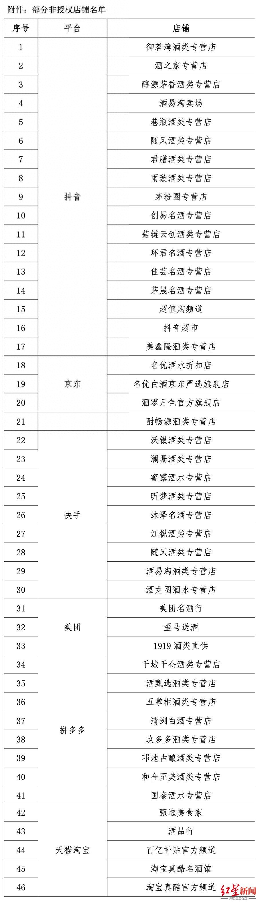 10月19日晚间,五粮液(000858.SZ)发布第四封致消费者告知书,公布在抖音、京东、快手、美团、拼多多、天猫淘宝等电商平台的46家非授权店铺,包括1919酒类直供、歪马送酒,以及抖音超市等。