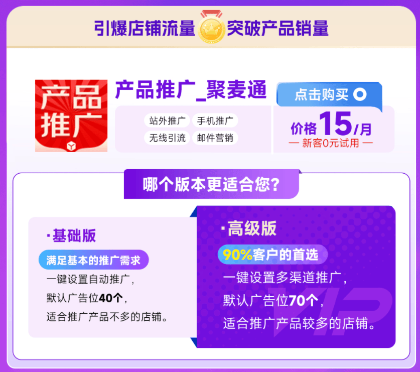 站外推广方式很多,不是每种都适合新手。要根据自己的产品和能力,选择一两种最可能有效的方式先试试水。当时新手商家我建议可以选择一款站外引流工具辅助做好新店推广,可以尝试【产品推广-聚麦通】,这款工具,适合新手商家,设置简单,只需要将您店铺要推广的商品选择好,系统会自动为您分发到站外网盟,简单高效。