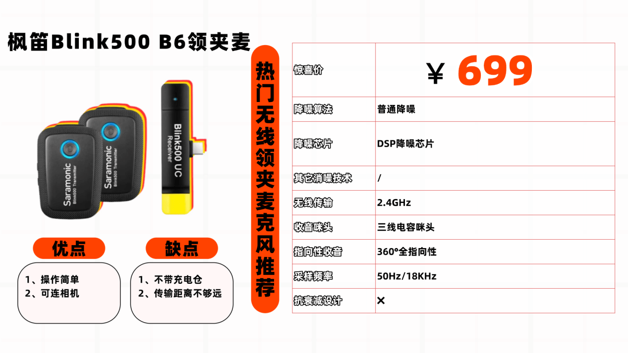 基础性能:内置基础降噪功能,可过滤部分环境杂音,传输距离满足日常拍摄需求,音质表现稳定,适合短视频、Vlog创作。