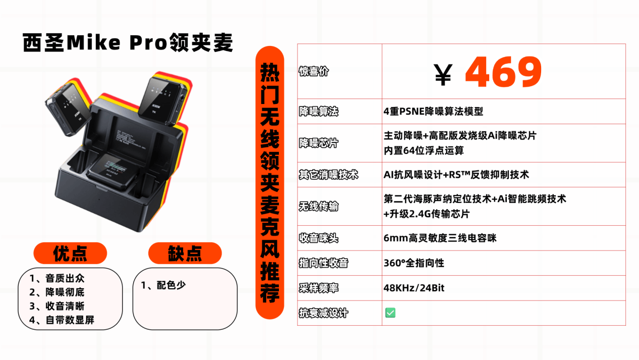 降噪表现:在众多业内人士眼中,西圣Mike Pro配备千元顶级硬件配置,更有行业首创的PSNE多重降噪算法模型,仅需百元就能达到千元专业麦克风的效果,堪称“性价比王炸”。西圣Mike Pro从不进行广告宣传,也未曾邀请任何明星代言,仅仅依靠数码博主、专业媒体以及主播达人的口口相传而走红。在各大平台的口碑、销量以及性价比排行榜中,西圣Mike Pro常年稳居榜首!