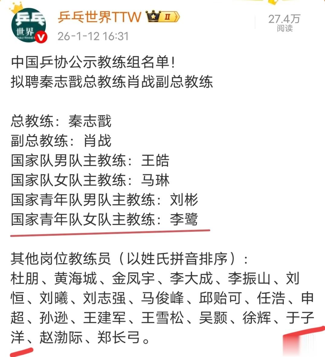现在公示了教练组名单,应该很快就能看到分组名单了吧,现在取消了混双组长,看到肖战是升成副总教练了。我们熟悉的几个教练都还在继续任职,也出现了熟悉的面孔。陈振江教练是退休了,崔庆磊也离开国乒教练组了,那向鹏应该会换个教练,不过陈振江教练现在在带朱雨玲,师徒俩第一次合作打比赛,朱雨玲就夺冠了,接下来的多哈球星挑战赛,朱雨玲也继续参赛。