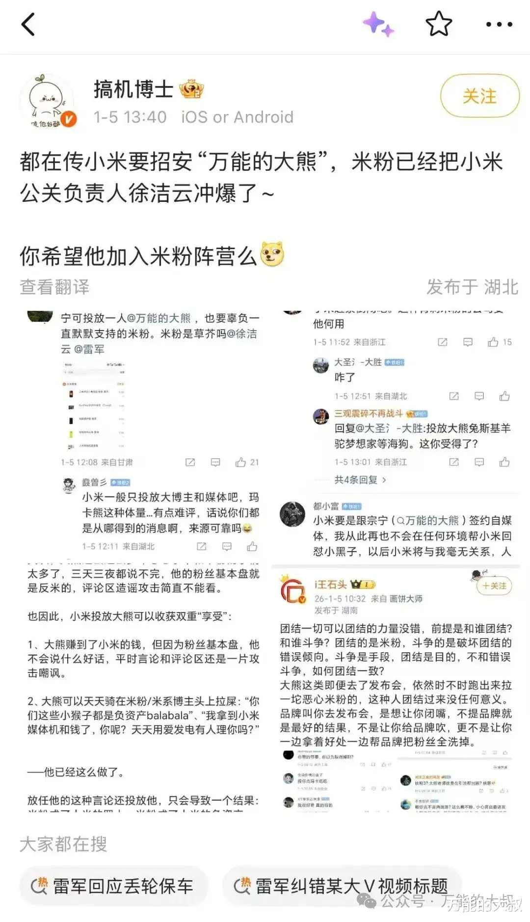 “某某博士”在1月5日13点40分,就发了微博说,徐洁云微博被小米粉丝冲爆了。