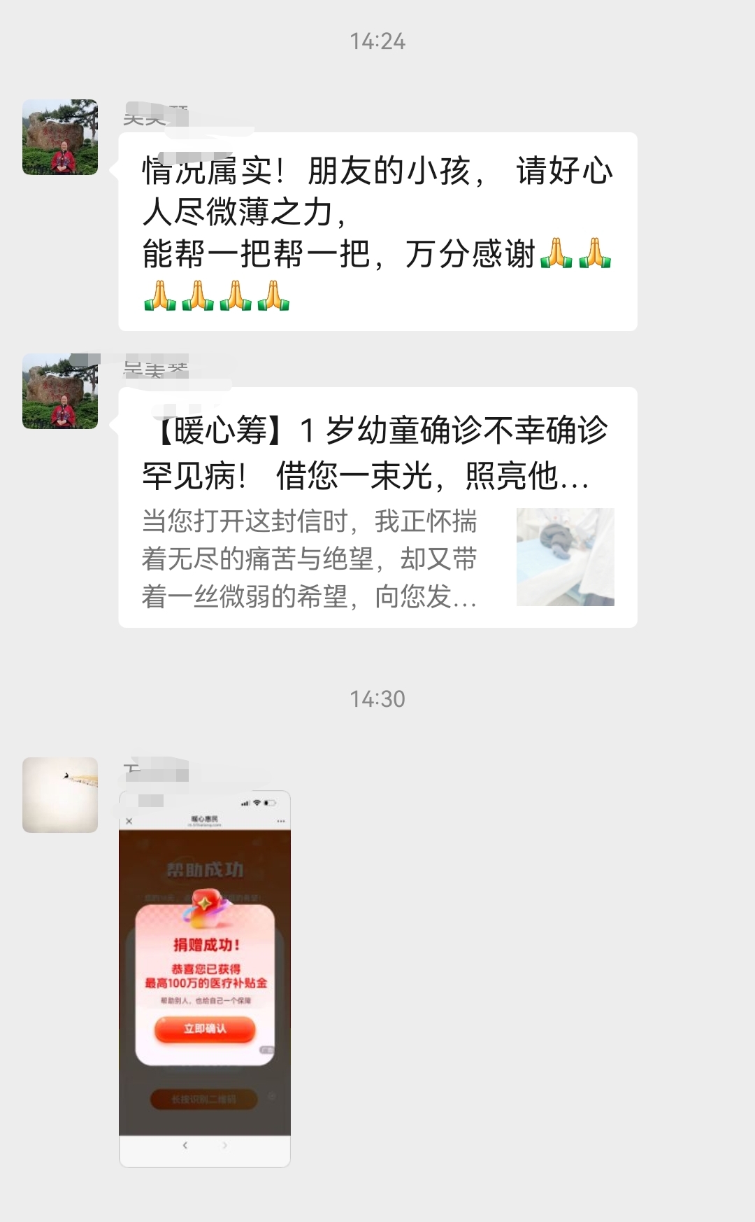 而转发到亲友们微信里的,却是一条以当事人名义发布的“一岁幼童不幸确诊……”的[暖心筹]链接,还附带“请帮一把”的文字。出于对亲友的信任和自身的善心,不少人纷纷打开链接捐款,从最初的几百元很快涨到几万元。