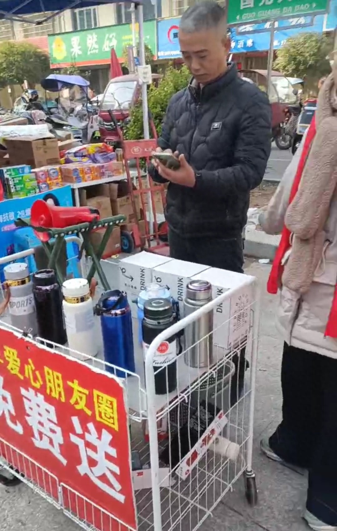 不同于以往送鸡蛋、脸盆诱骗听课买劣质产品的老套路,此次骗子将目标转向了人们的同情心。超市门口摆着“分享爱心朋友圈,免费送”的摊位,多款保温杯摆在显眼位置吸引路人。据受骗街坊回忆,想要拿到免费保温杯,不仅要按要求发朋友圈,还得达到骗子指定的分享要求,甚至有摊主直接拿过路人的手机操作。