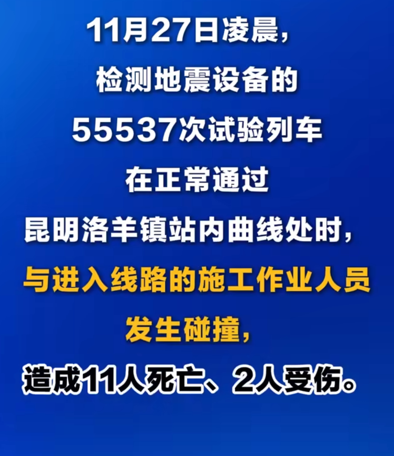 凌晨的黑暗里,一场突如其来的悲剧,如同一记重锤,狠狠砸在了每一个人的心头。一列用于检测地震设备的试验列车,在正常行驶至昆明洛羊镇站内曲线处时,与违规进入线路的施工作业人员发生了剧烈碰撞。那一刻,时间仿佛凝固,11条鲜活的生命戛然而止,2人受伤,他们的家庭,瞬间被阴霾笼罩。