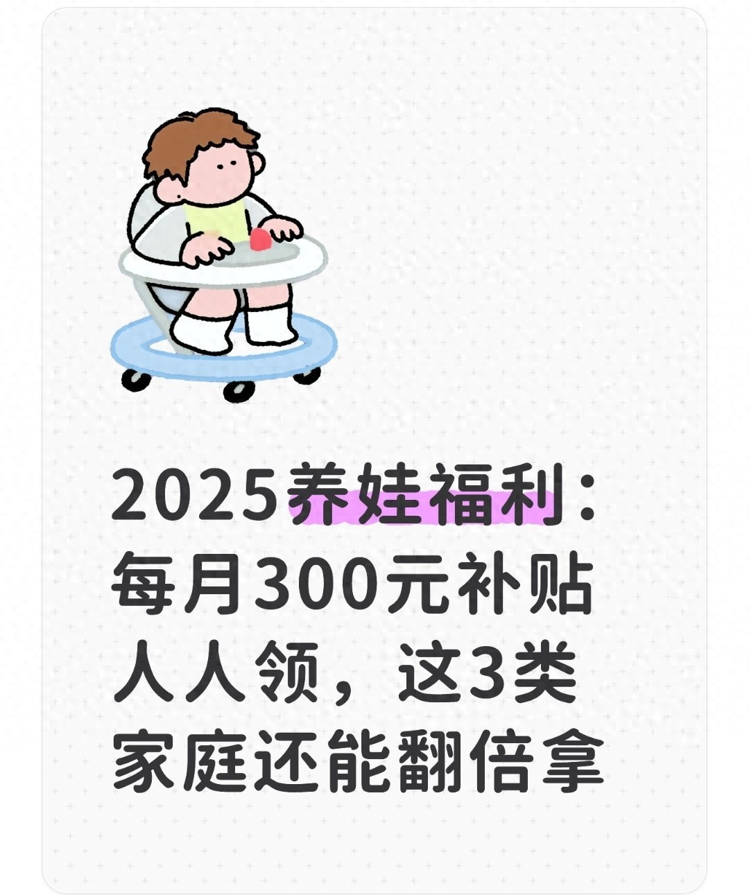 2025年养娃福利大调整!国家放大招,每月300元补贴直接到账,还有3类家庭能领双倍!家有萌娃的家长们,赶紧看过来,这份福利清单能帮你省下一大笔钱!