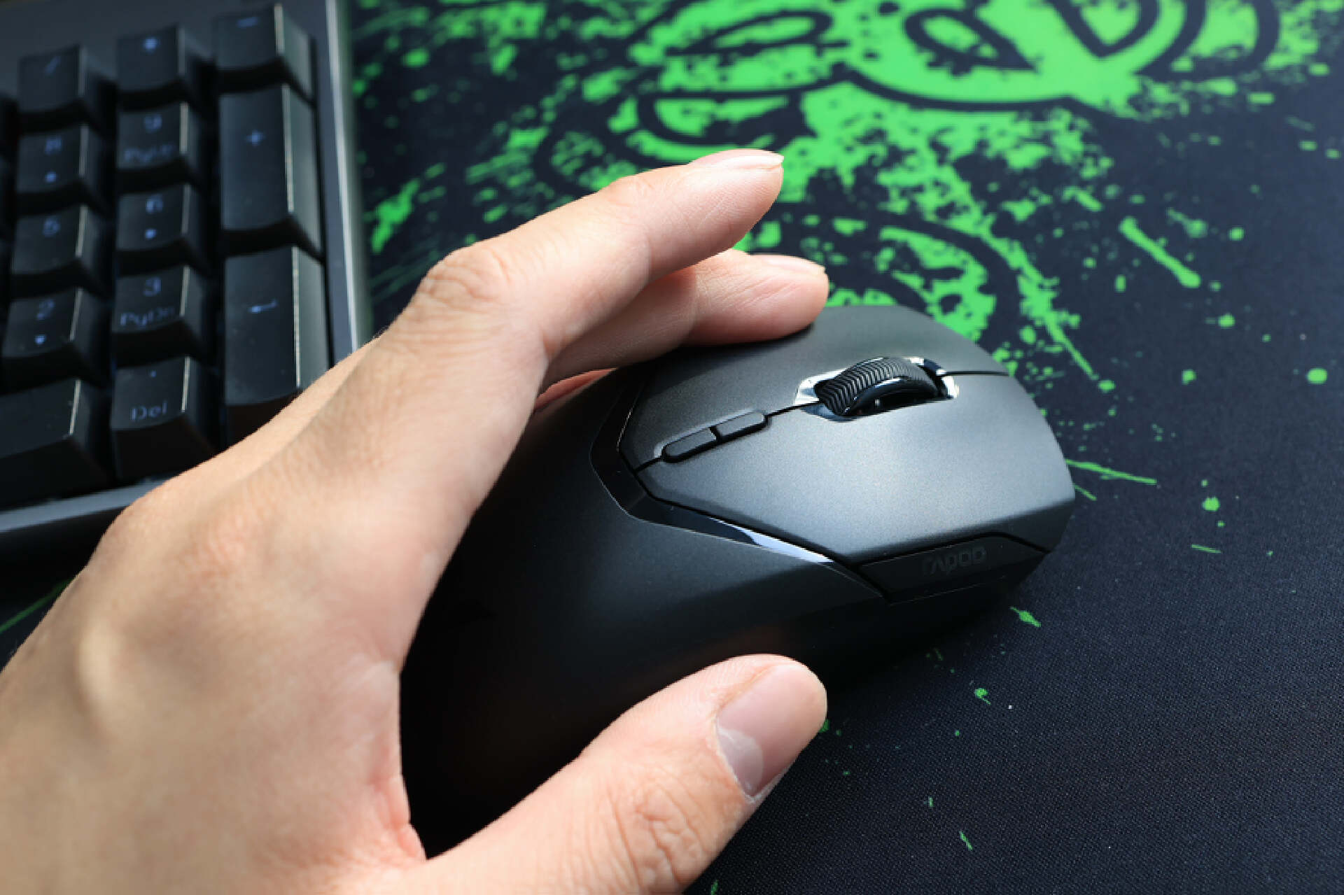 在鼠标底部还有一个最明显的红色按钮,它就是新增的DIY按键。也许大家会好奇为什么它会放在鼠标的底部?其实刚开始我也有这样的困惑,但了解了以后才发现,雷柏真的是懂我们游戏用户的。鼠标上的自定义按键一旦设计的过多的时候,就有一定的概率出现误触,在游戏中反而造成不好的体验,而这枚DIY按键的自定义的自由度很高,甚至还可以直接操作锁定电脑。