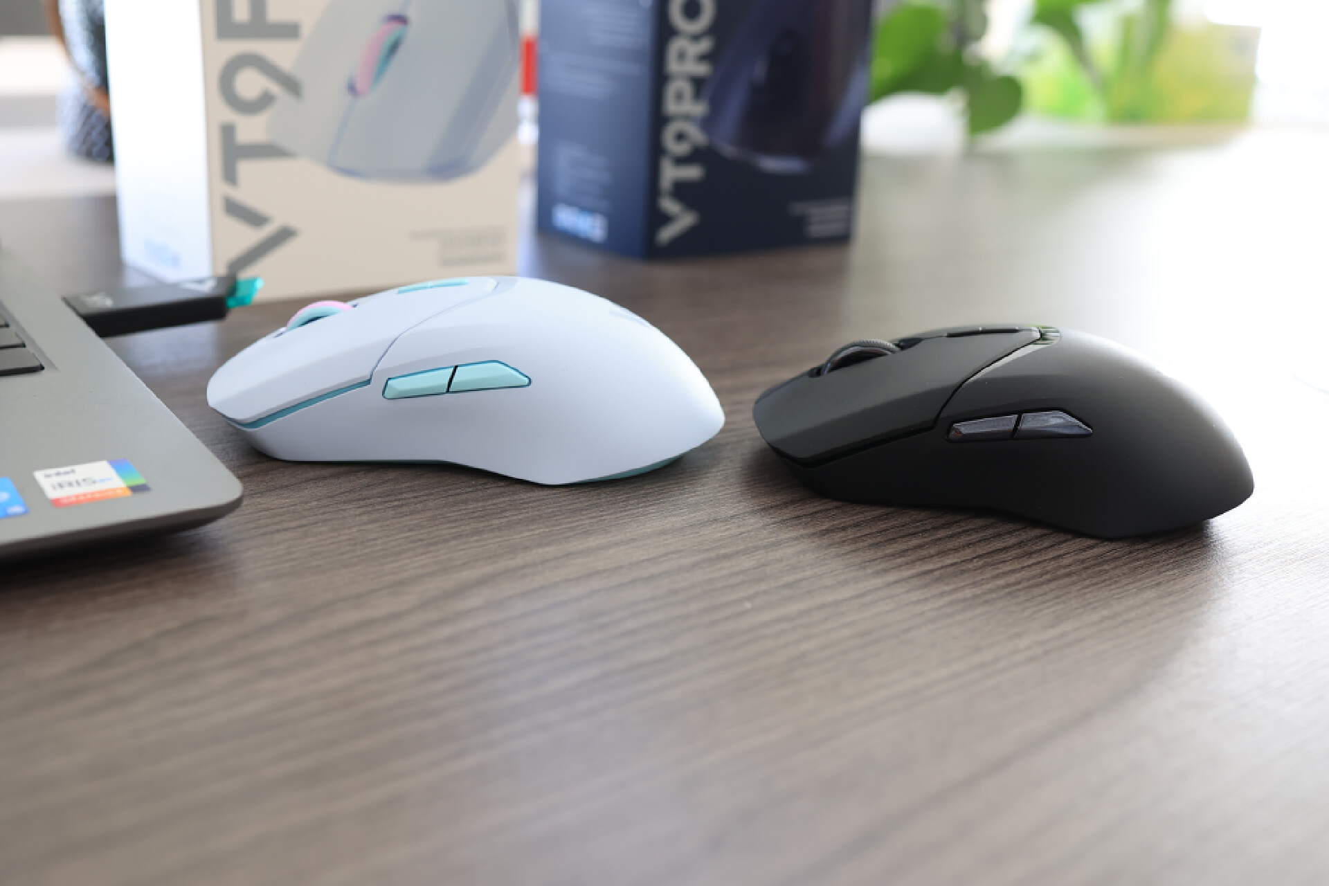 起初,对于VT9Pro和VT9Pro Mini,我以为Mini版会减配了一些功能。没想到的是,Pro和Mini版,只有大小上的区别,其他功能上都是一样的。Pro版的尺寸为124.9*67.1*40.2mm,更适合中大手。Mini版的尺寸为120.1*65.8*37.5mm,对于小手玩家特别友好。接下来就说说它们的亮点吧。