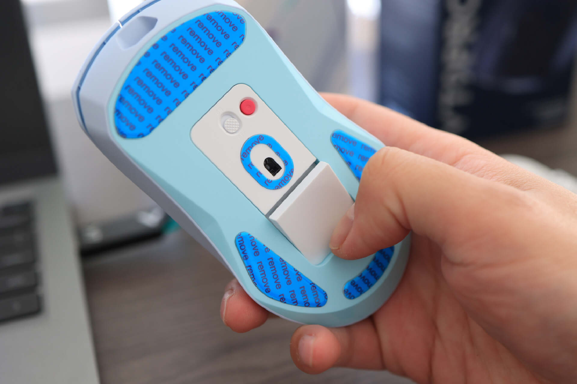 在鼠标的背面,除了有开关以外,还有一个可吸附式的隐藏盖子,在里面收纳了鼠标的信号接收器,当需要外出携带的时候,可以有效的避免接收器易丢失的问题。在鼠标的周围,还贴有一层特氟龙脚贴,大家使用前记得将最外层的贴纸撕掉即可,它可以有效的提高鼠标底部的耐磨性和移动体验。此外,这款鼠标内置800mAh的电池,,只需要额外购买无线充电模块,就可以无线充电。在满电的情况下,可以实现160个小时的续航。