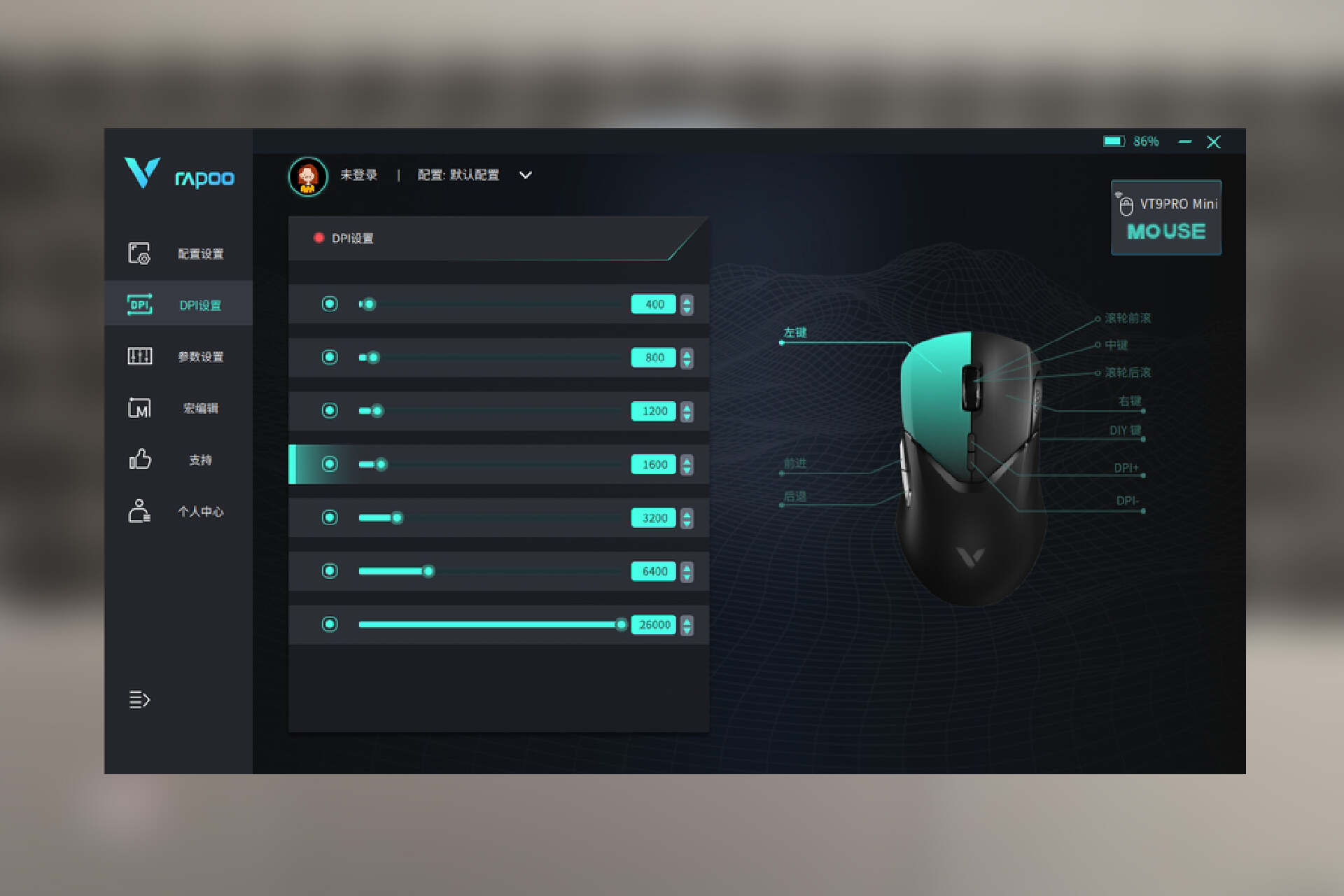 在使用之前,我们可以先在PC内对自定义DPI的数值进行设置,默认最低数值为400,最高为26000。可以完全根据自己的游戏需要进行七个不同的档位数值设置。