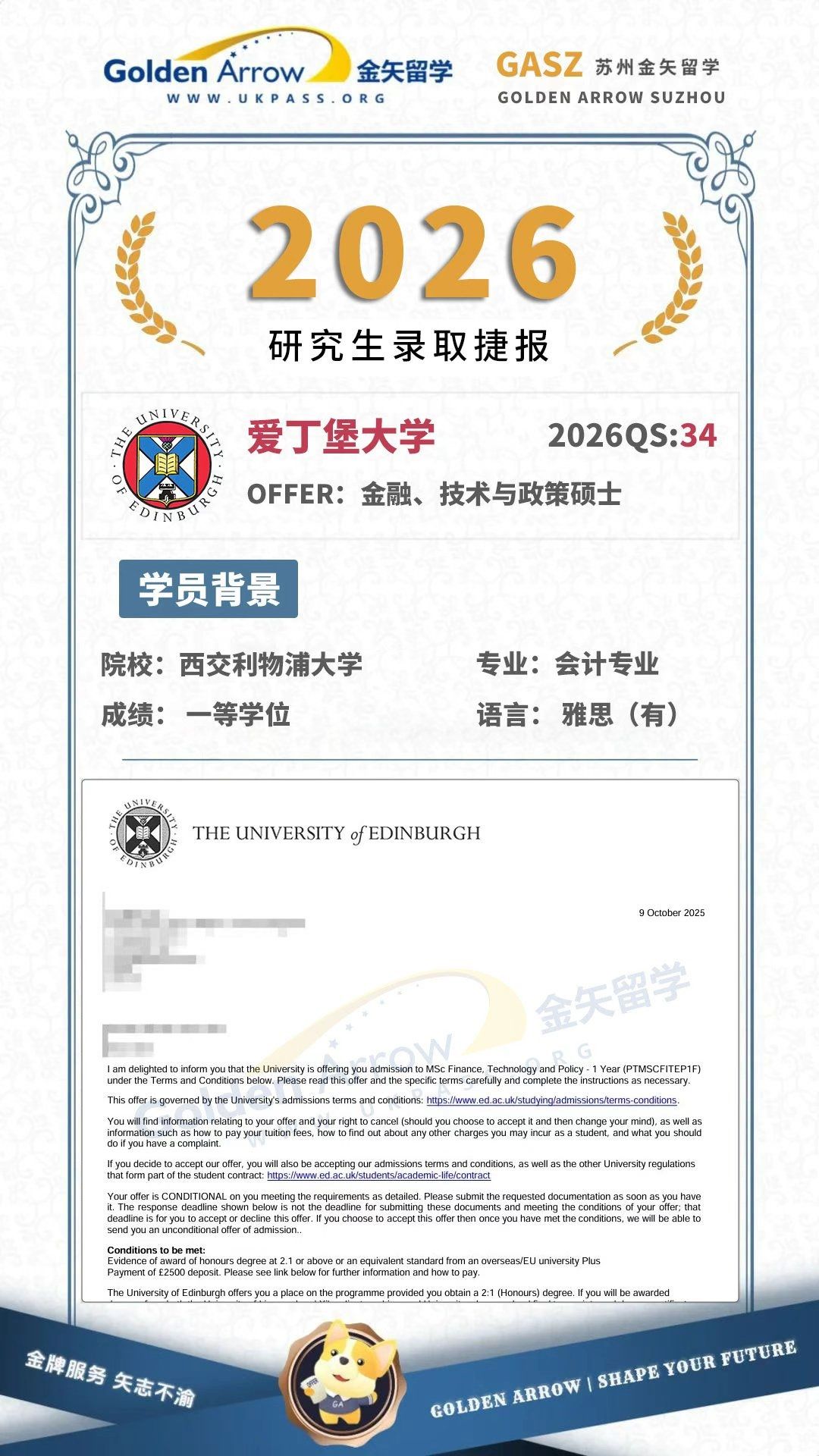 爱丁堡大学金融、技术与政策硕士录取offer