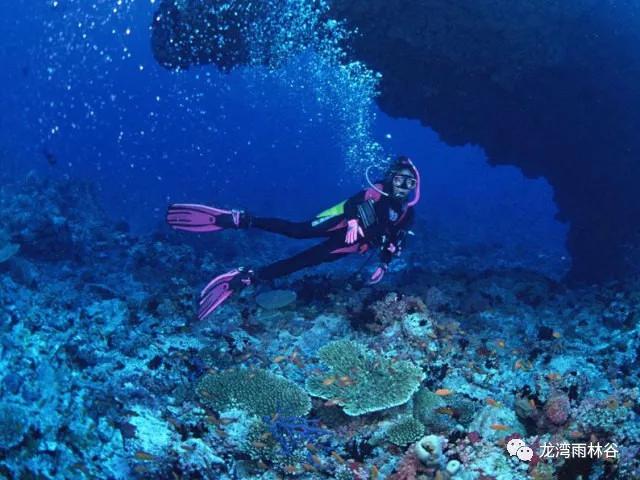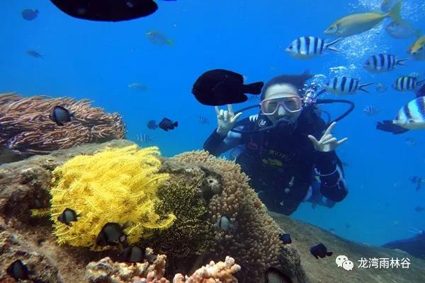 蜈支洲岛享有"潜水基地"美誉。四周海域清澈透明,海水能见度6~27米,水域中盛产夜光螺、海参、龙虾、马鲛鱼、海胆、鲳鱼及五颜六色的热带鱼,南部水域海底有着保护很好的珊瑚礁,是世界上为数不多的没有礁石或者鹅卵石混杂的海岛,是国内潜水基地,极目远眺,烟波浩渺,海天一色。