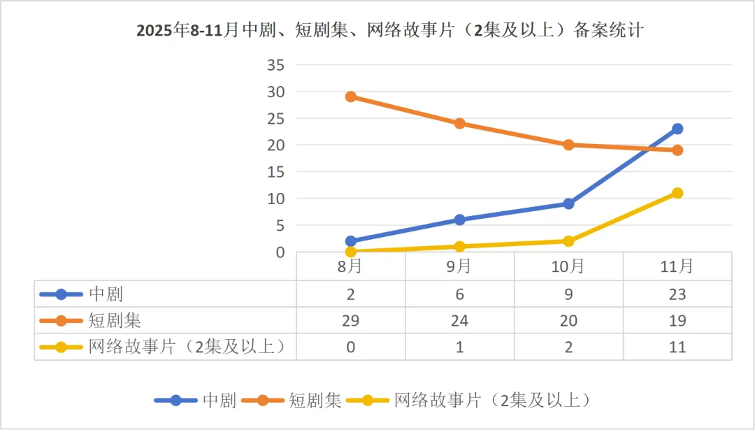 一是2025年8—11月,中剧、短剧和网络故事片(2集及以上)的备案部数统计数据。