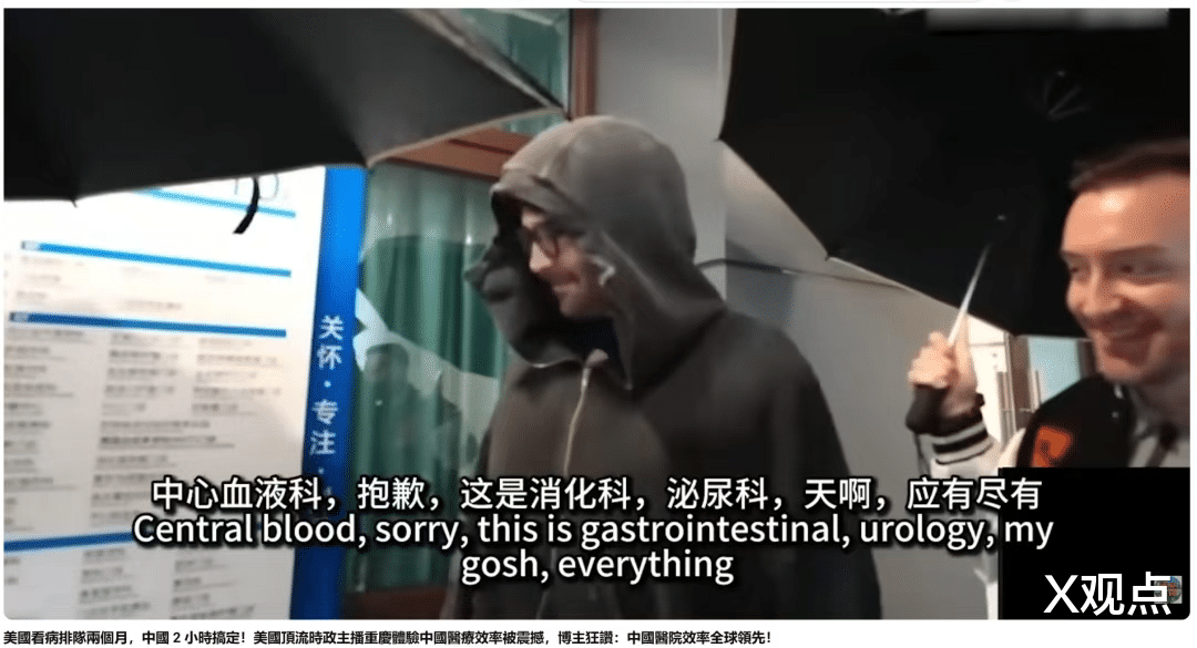第三步,渲染对比。把中国的"便宜高效"和国外的"昂贵低效"做强烈对比,刻意忽略国内看病"一号难求"、手术排期动辄数月的现实。实际上,在中国,普通人想挂个知名专家号,等上三五个月也是常态。