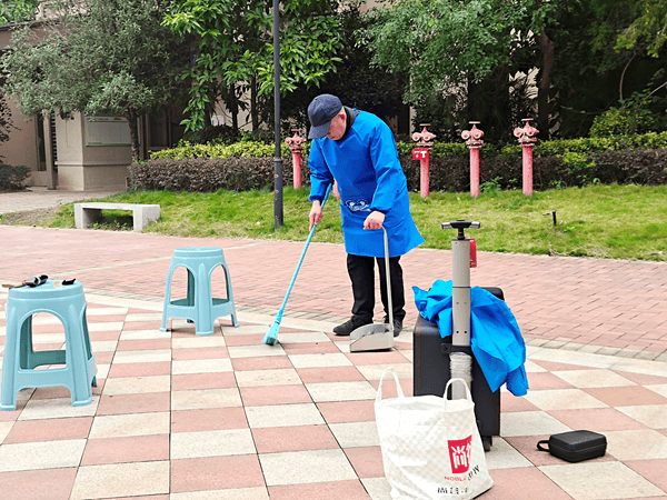 当日12时许,黄诚谊提前备齐理发工具,准时抵达服务点位,快速摆放好凳子,逐一取出围裙、梳子、推剪等用品,做好各项准备工作后,静静等候居民前来。