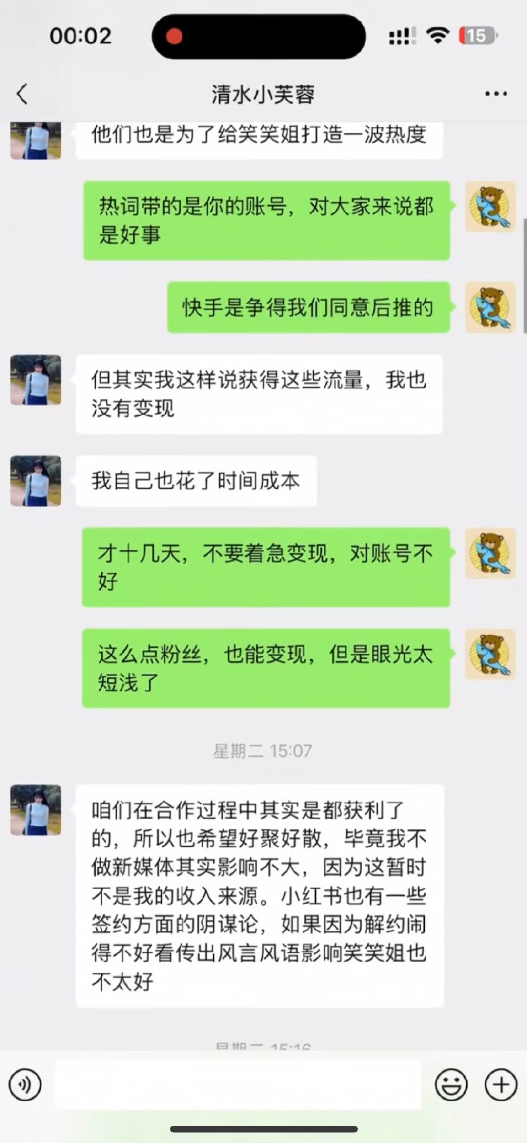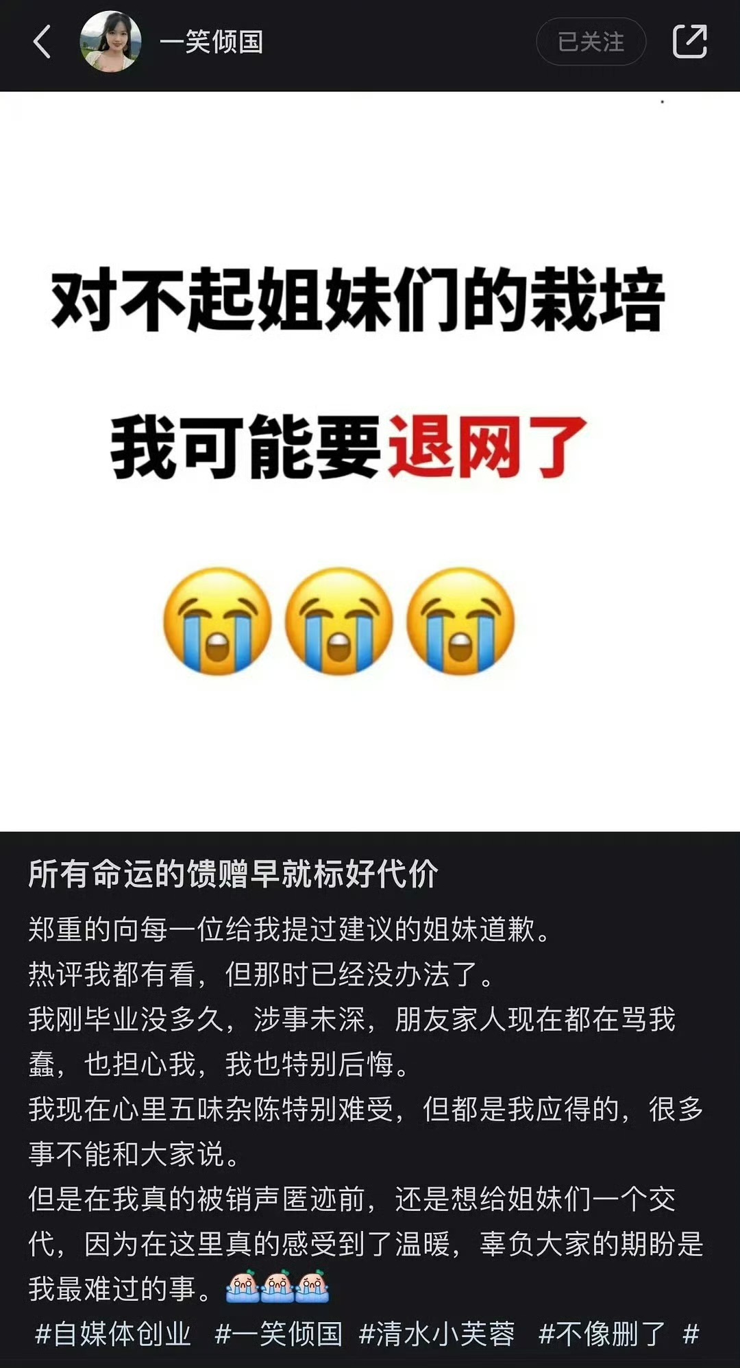 2023年初,一位名叫清水小芙蓉的00后大学生凭借模仿网络红人一笑倾城的视频在网络上引起了轰动。以其独特的风格和才华,她迅速吸引了大量粉丝,被誉为新生代的网络宠儿。不久之后,一笑倾城本人注意到了这位年轻的挑战者,邀请小芙蓉加入自己的公司,并签署师徒合约,承诺提供资源支持与事业发展机会。然而,甜蜜期并未持续太久。小芙蓉在一段时间后宣布可能退出网络平台,理由惊人地直指财务困境。她声称,加入一笑倾城的公司后,非但未实现财富梦想,反而面临高达数百万元的债务风险,这一消息立刻引发网友关注与讨论。小芙蓉的言论在社交媒体上迅速发酵,将一笑倾城推向风口浪尖。面对质疑,一笑倾城并未退缩,而是选择公开回应。在一次直播中,她展示了与小芙蓉的聊天记录,证明从未有过欺瞒或压迫行为,合同中亦不存在高额违约金条款。她强调,曾主动提议利润分成方案,以公平原则解决分歧,但小芙蓉在接受一定流量红利后,却单方面要求解约。一笑倾城公司负责人也加入解释行列,指出小芙蓉的选择虽合情合理,但未考虑到合同履行义务,解约将带来预期损失。随着事件升级,法律专家纷纷介入分析。从版权法角度看,小芙蓉在利用一笑倾城品牌资源获利的同时,应按约定承担责任。双方的合同是基于自愿基础上达成的合作协议,小芙蓉若单方终止,确实存在一定的法律责任风险。另一方面,一笑倾城的公司作为投资方,有权追究违约责任,维护自身利益不受侵害。主流媒体与自媒体争相报道此事,舆论场上呈现两极分化。一部分网民同情小芙蓉,认为她是“被迫签约”的受害者;另一部分则站在一笑倾城一边,指责小芙蓉缺乏契约精神。在这场网络风暴中,事实真相愈发模糊,谁是谁非难辨真假。面对舆论与法律双重压力,双方似乎都在寻找最佳解决方案。一笑倾城表示愿意再次协商,希望通过和平方式解决问题。而小芙蓉一方也表达了调解意愿,希望能在法律框架内找到合理的出路。最终能否化解分歧,回归初心,尚待时间考验。