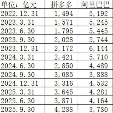 在现金储备方面,截至2025年9月30日,拼多多现金、现金等价物及其他短期投资达4238亿元,今年以来净增922亿元;而阿里的现金储备在2023年底达到6144亿元顶峰后,这两年一直在下滑,尤其今年投入外卖大战后,阿里的现金快速减少,在今年三季度首次被拼多多超过。