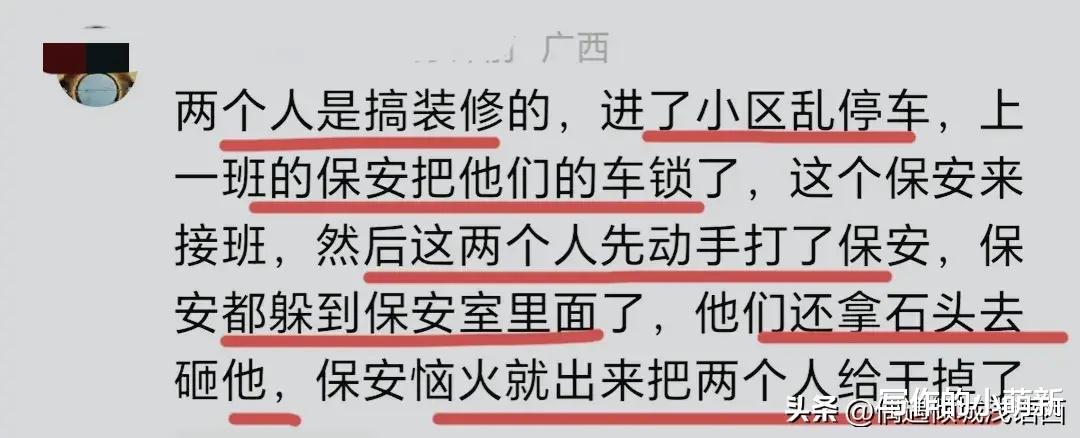 在这样的事件中,我们也可以看到,保安在处理矛盾和纠纷的时候,确实还存在着一定的问题和困难。相关的部门也应该对保安进行一定的关心和帮助,加强对其心理素质的培训和提升,让他们能够更好地适应工作中的各种挑战和考验。