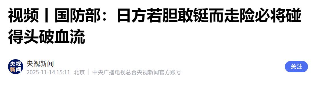 11月14日,国防部发布:日方若胆敢铤而走险必将碰得头破血流。