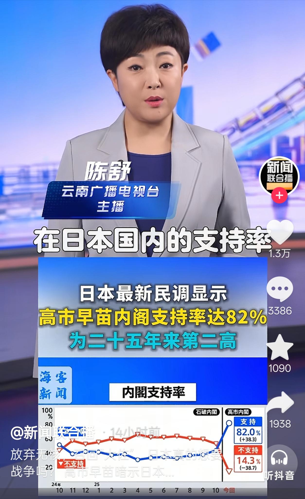 答案一目了然,据日本最新民调显示:高市早苗内阁支持率高达82%,为25年来第2高!