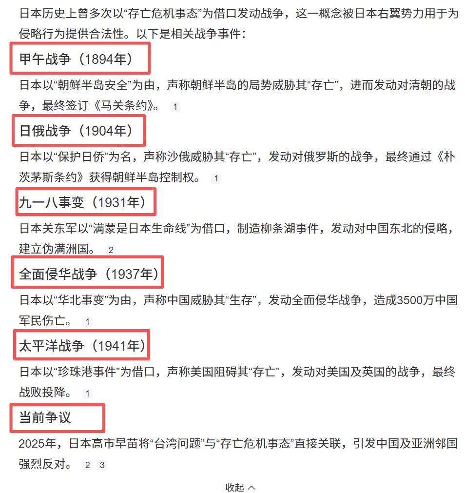 再联系高市早苗国会发言:“如果‘台湾有事’,发生紧急状况伴随对方使用武力,可能会构成日本可以行使集体自卫权的‘存亡危机事态’”。
