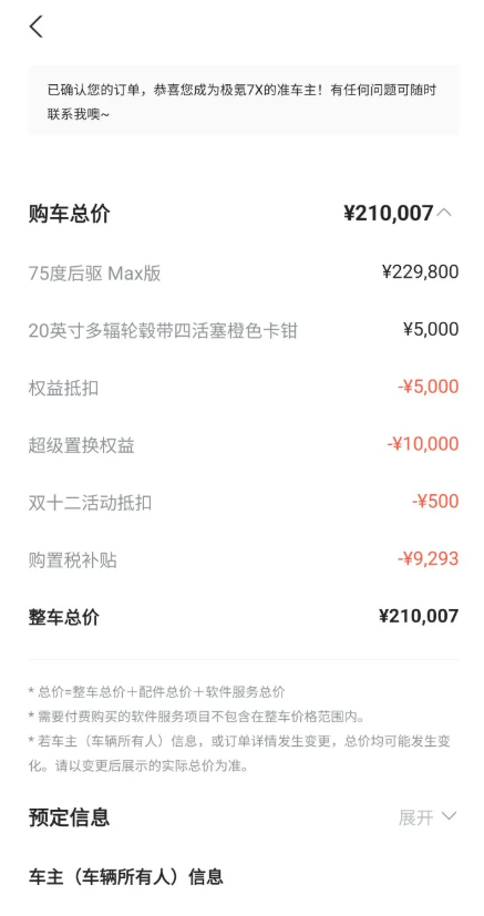 11月订了7X大电池版,本来以为1.1之前铁能提车,年底交付就一直催款,我没理他,坚持要验车后再付款。今天通知我的车到了,极氪承诺的购置税补贴,已经在车价里减了,再加上还能享受26年置换补贴,简直不要太香。