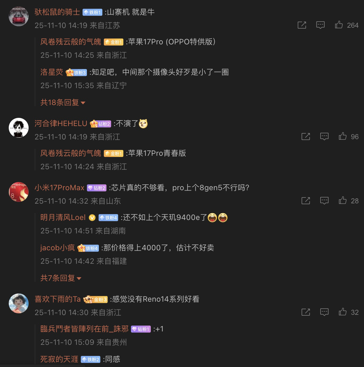 在社交平台,网友们对OPPO Reno15系列的评论呈现明显的两极分化,领了任务以及为代言人宋雨琦而来的粉丝,大量点赞和转发。截至11月10日18时,OPPO与宋雨琦共创的一条微博转发与点赞的数量均突破了“10万+”,评论中“宝宝”、“好美”等关键字刷屏。