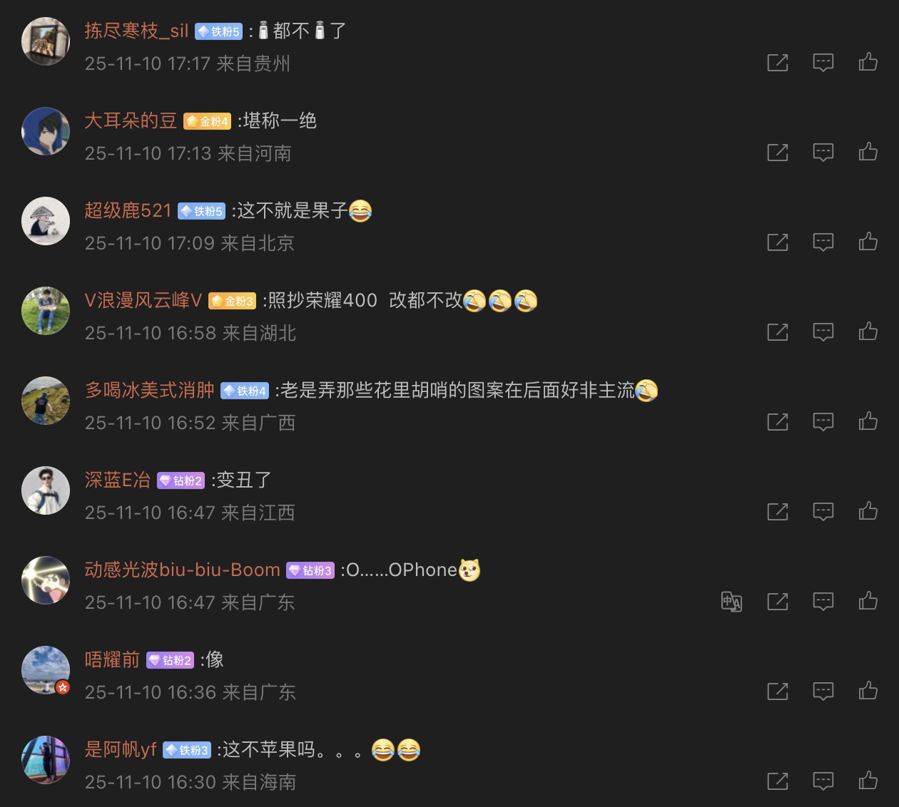 从去年的Reno13系列启用新设计以来,这已经是Reno系列与iPhone撞脸的“果三代”了,甚至连旗舰Find X9系列的风格今年也全面“果化”,此举引发许多OPPO老用户的不满。对于网友点评的“OPhone”,OPPO毫不忌讳,甚至还专门申请了专利。
